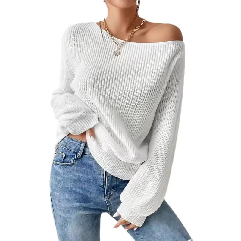 Осенне-зимний стиль Уникальный пуловер с открытыми плечами Вязаный Однотонный Свободный крой Повседневный Универсальный пуловер Воротник-одна полоса