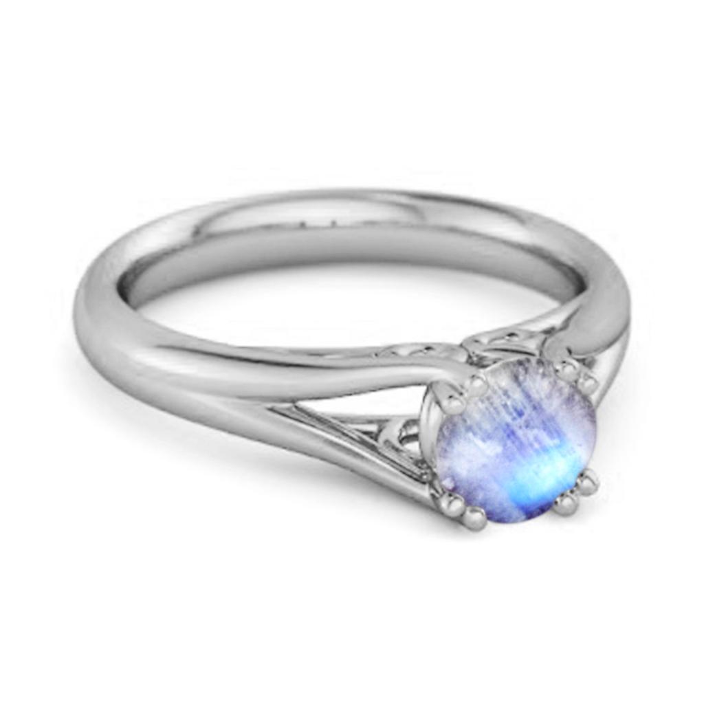 Sterling silver bypass ring with 6mm round Moonstone (0.75 Ct). A serene, mystical design perfect for daily elegance.