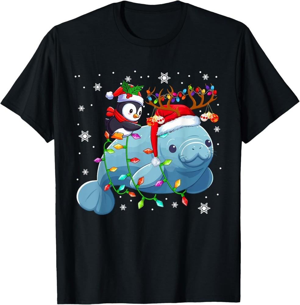 Рождественская футболка с пингвином Сантой, едущим на олене, и ламантином