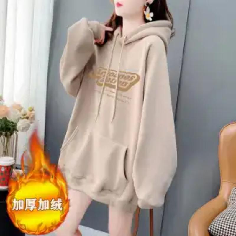 Бархатный Утепленный Карманный Худи для Женщин Осень и Зима Новый Стиль Свободный Топ и Куртка Средней Длины Трендовый