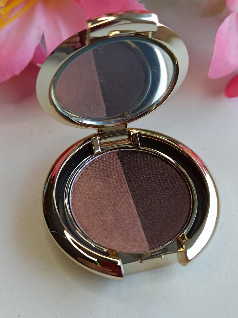 Это двойные тени для век в компактном золотистом футляре с зеркальцем. Основные фишки: * Удобство: Миниатюрный формат, который легко поместится в любую сумочку. * Цвета: Сочетание двух классических оттенков — сияющего розового золота и глубокого графитового для создания как дневного, так и вечернего образа. * Дизайн: Элегантная круглая упаковка, открывающаяся на 180 градусов для удобного использования зеркала. Итог: Практичный вариант «два в одном» для тех, кто любит обновлять макияж на ходу.
