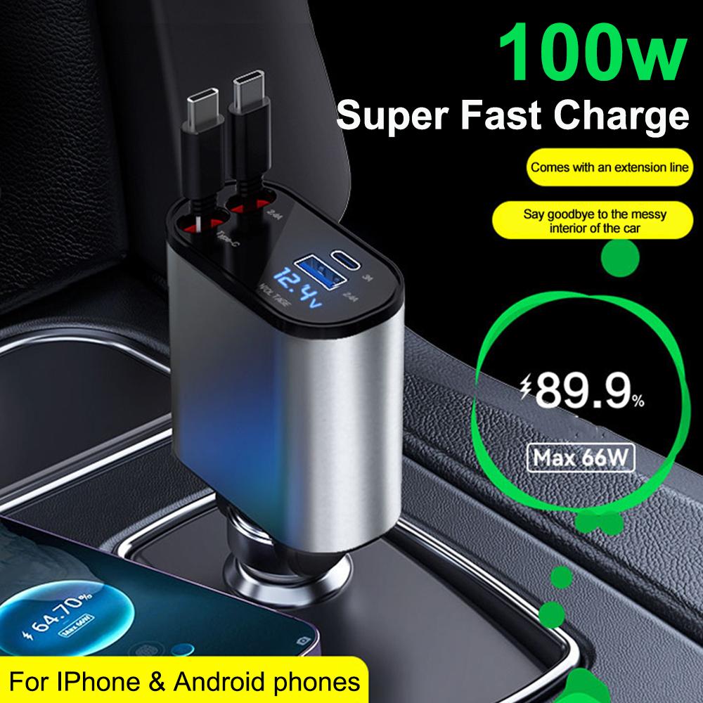 Автомобильное зарядное устройство 100 Вт PD+USB быстрое зарядное устройство с 2 выдвижными кабелями Type C быстрое автомобильное зарядное устройство вольтметр 4 в 1 питание для iPhone Huawei
