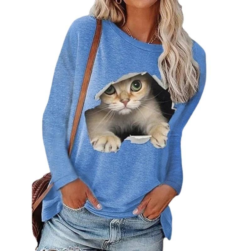 Трендовый осенне-зимний модный женский пуловер с круглым вырезом, футболка с длинным рукавом и принтом кошки