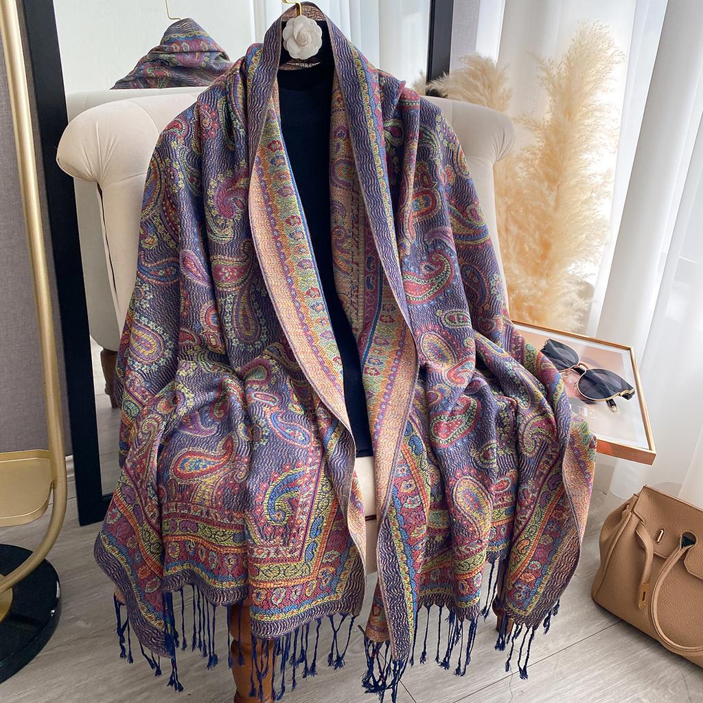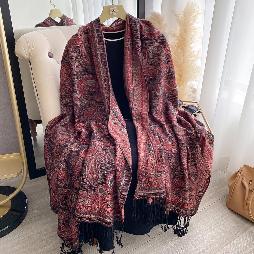 Женский Модный Зимний Фуляр из Искусственного Кашемира с Винтажным Принтом и Кисточками, Толстый Теплый Пашминовый Двусторонний Шарф, Уличные Шали