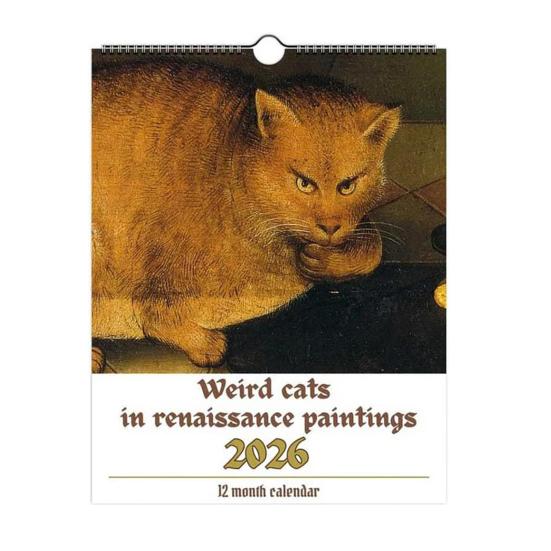 Уникальные произведения искусства эпохи Возрождения и Средневековья с кошками: Этот календарь, демонстрирующий двенадцать месяцев смешных странных кошек, иллюстрированных в стилях искусства Ренессанса и Средневековья, предлагает отличительное сочетание юмора и классического искусства.. Он понравится как любителям кошек, так и ценителям искусства, представляя собой причудливый, но изысканный декоративный элемент для любой стены.