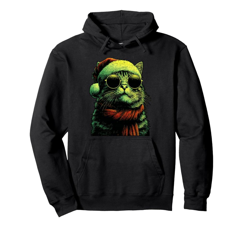 Punk Tabby Cat with Sunglasses and Santa Hat, Christmas Rocker Hoodie