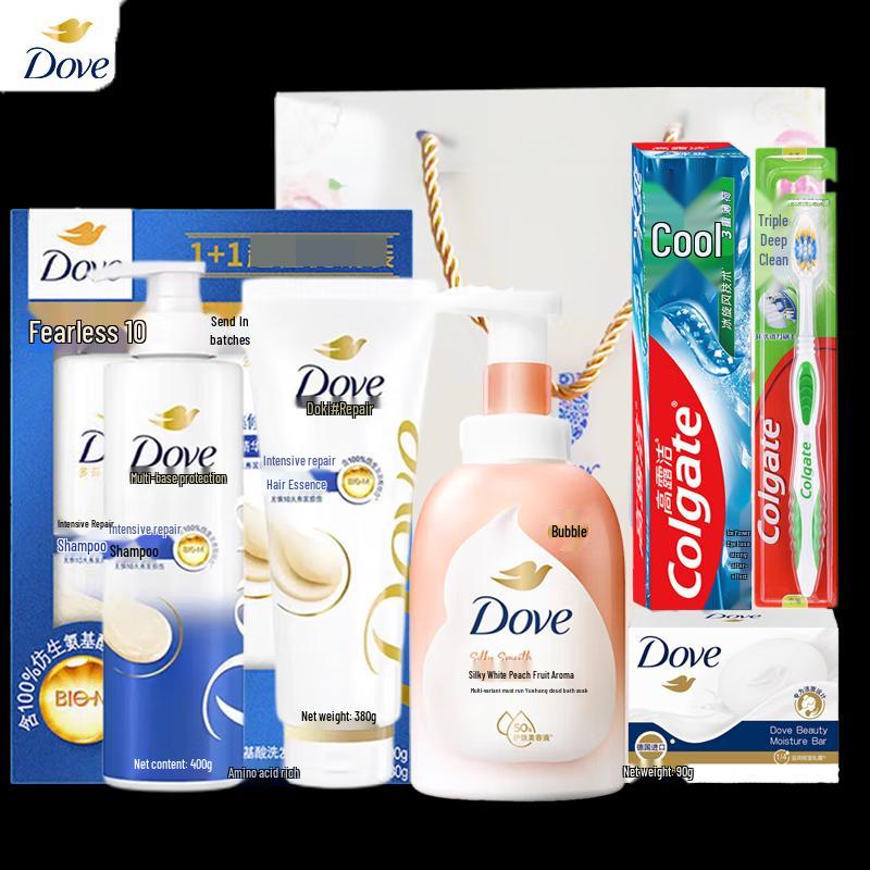 Discover the ultimate personal care experience with the Dove 6-Piece Personal Care Essentials Gift Set. This comprehensive kit includes shampoo, conditioner, shower gel, soap, toothpaste, and a toothbrush, all designed to moisturize, repair, and cleanse your skin and hair. Perfect as a gift, this value set comes in a convenient gift box with a total net content of 1.49kg and a 3-year shelf life.