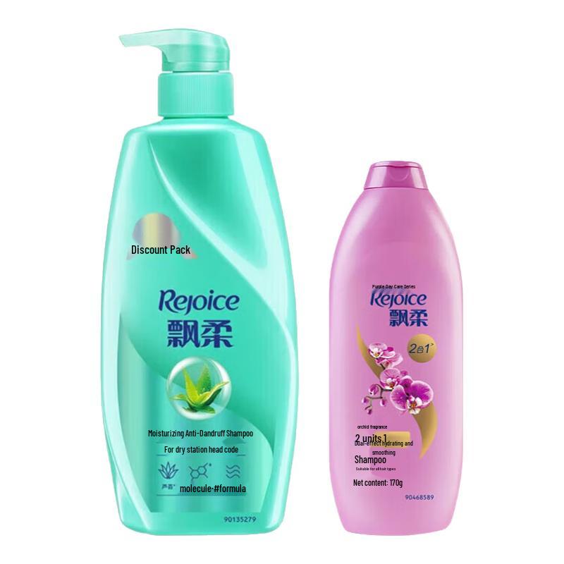 Experience comprehensive hair care with the Rejoice Shampoo Bundle. This set includes a 700g bottle of moisturizing and anti-dandruff shampoo, paired with a 170g bottle of dual-effect moisturizing and smooth cleansing shampoo, totaling 870g. Designed to cleanse, nourish, and reduce dandruff, leaving your hair smooth and healthy. Please note: new and old packaging may be shipped randomly.