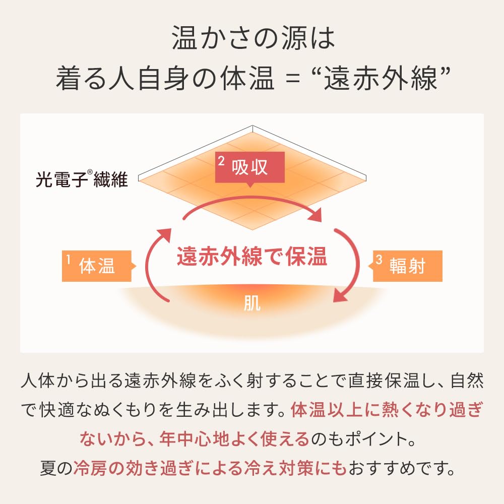 [Фотоэлектрический материал x Эффект дальнего инфракрасного излучения]: Изготовлено из специального материала, содержащего «Фотоэлектрическую керамику», которая поглощает тепло тела и преобразует его в естественное тепло в виде инфракрасных лучей.. Он нежен к коже и обеспечивает отличное сохранение тепла, несмотря на свою тонкую, пушистую структуру.. Он удобный и не становится душным, что делает его подходящим для использования в любое время года.
