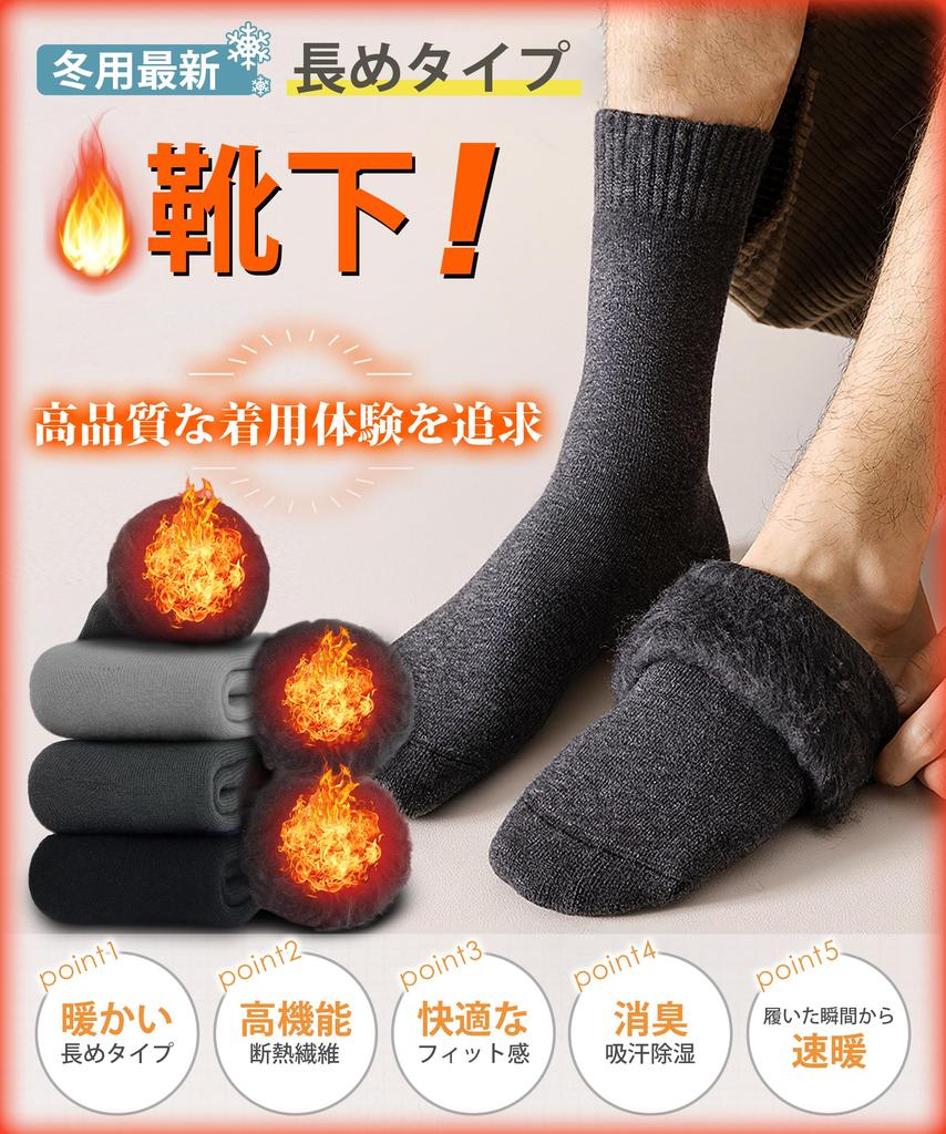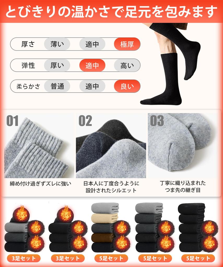 [Защита от холода суровой зимы и новейшие удлиненные зимние носки] Улучшенные с учетом длины японских стоп, эти носки превышают традиционную длину и обеспечивают двойной стиль: модный и защищающий от холода.. Эти высококачественные хлопковые носки для мужчин изготовлены из премиальной смеси хлопка и полиэстера, обеспечивающей идеальный баланс тепла и долговечности.. Шерстяная смесь обеспечивает превосходное удержание влаги, влагопоглощение и тепло, поддерживая температуру тела без перегрева для длительного комфорта.. По сравнению с обычными зимними носками весом 45 г, наши мужские носки толще, теплее, дышащие и износостойкие, весом максимум 75 г, сохраняющие ваши ноги в тепле даже при минусовых температурах.