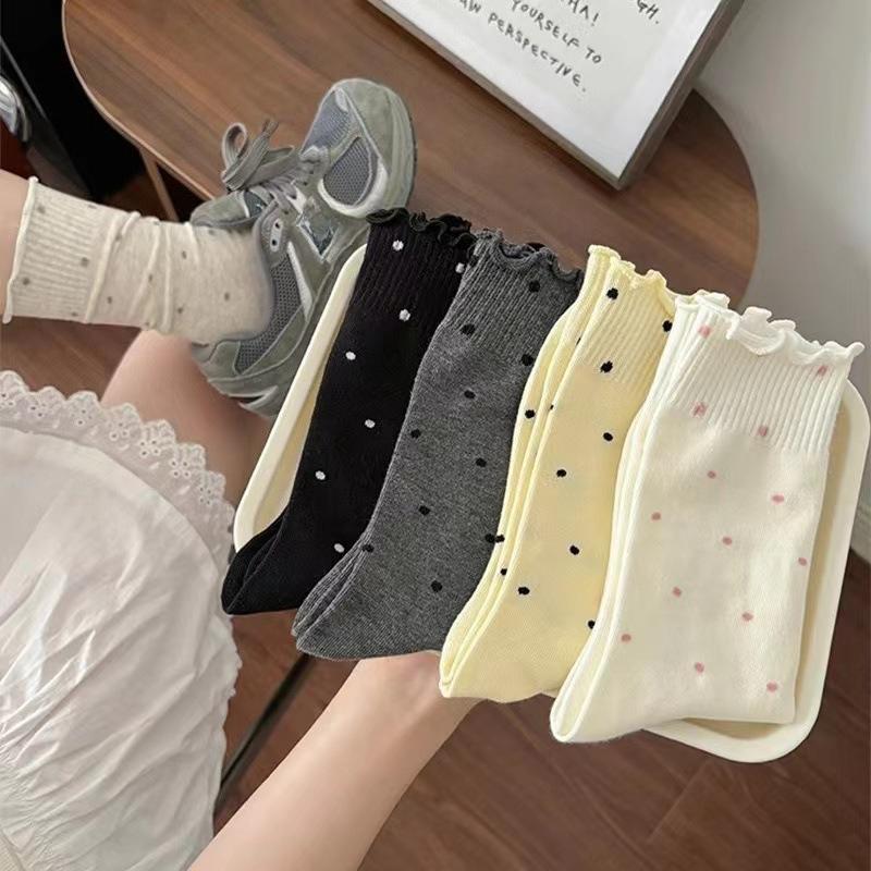 Серые женские носки до середины икры, тонкие осенние носки в горошек с кружевом, черные носки-гольфы с ушками в балетном стиле для осени и зимы