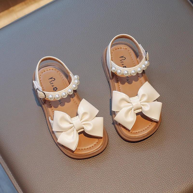 Детская обувь Bow Pearls Open-toe 2024 Новые летние туфли на плоской подошве для детей Повседневные сандалии для девочек Нескользящие PU простые японские сандалии для платьев