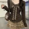 Женский кардиган с бантом, корейский стиль, V-образный вырез, вставки из кружева на шнуровке, однобортный, женский свитер, осенний модный свободный удобный женский топ