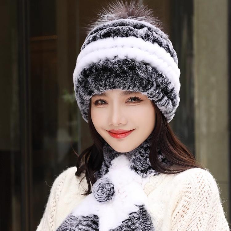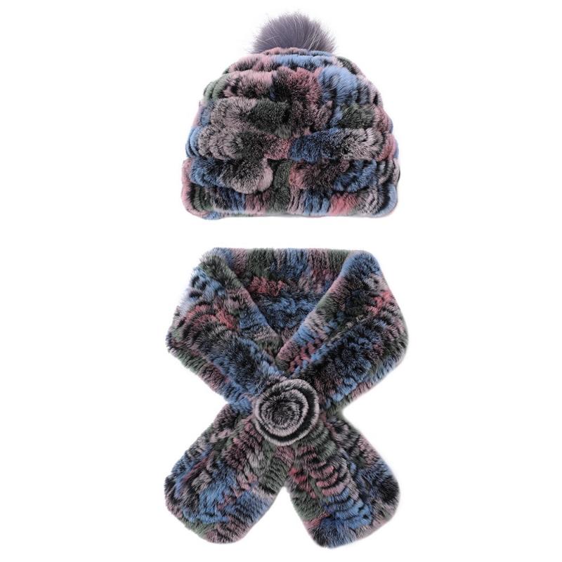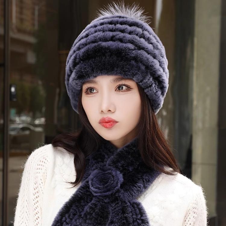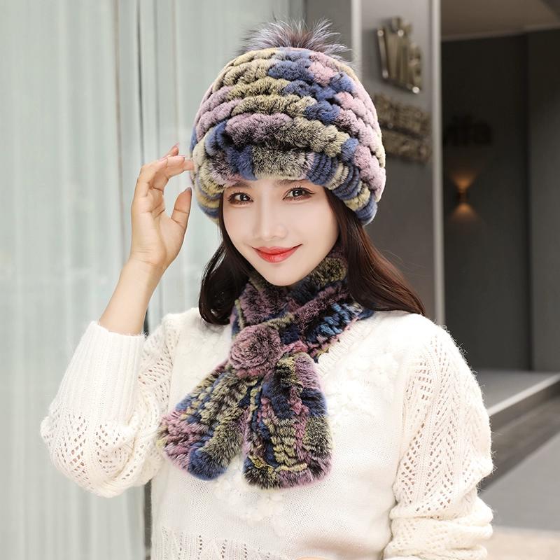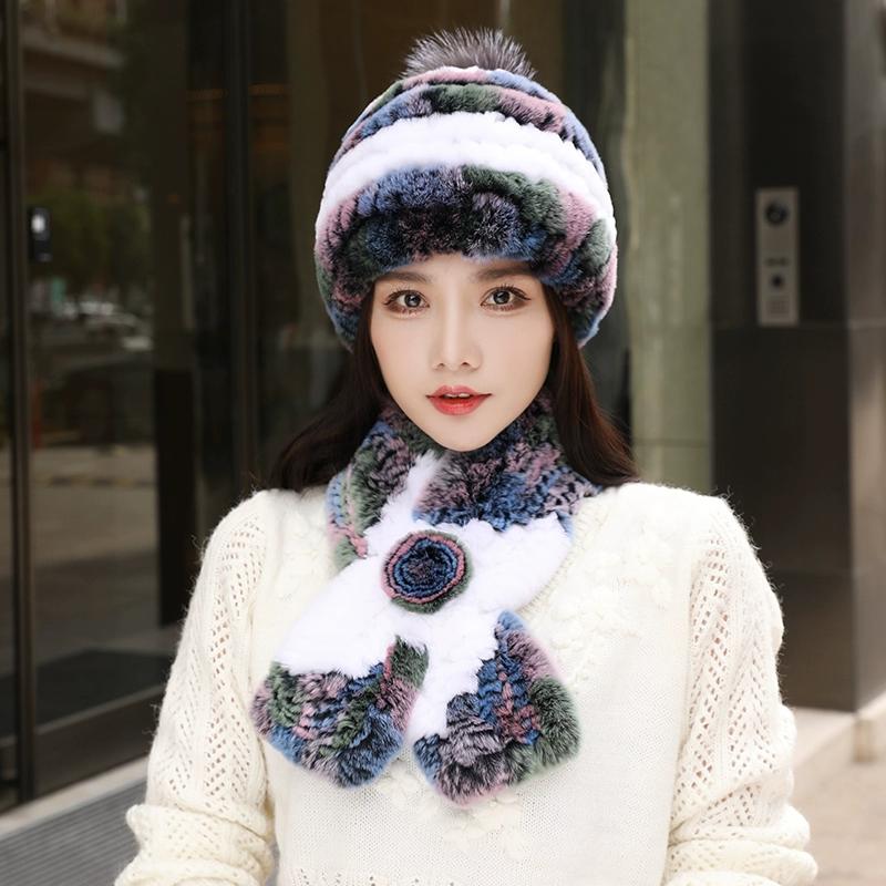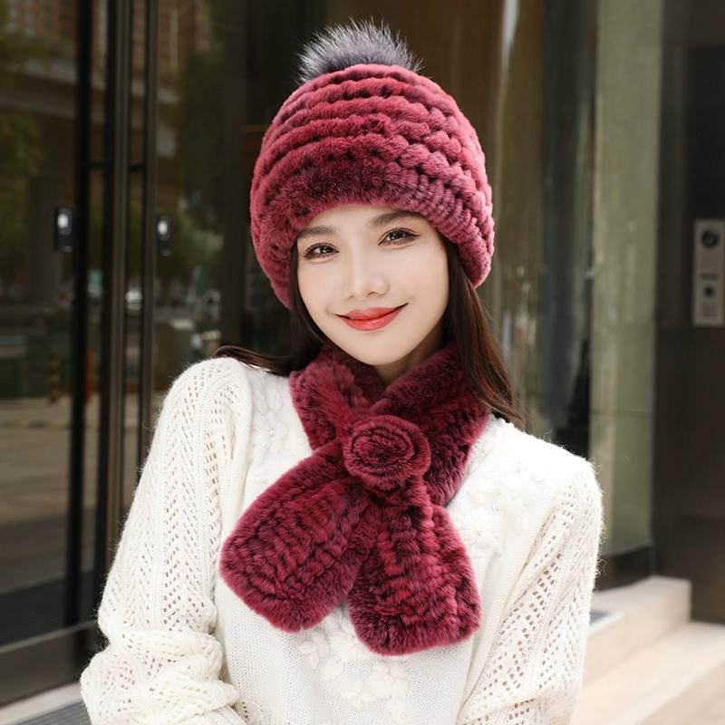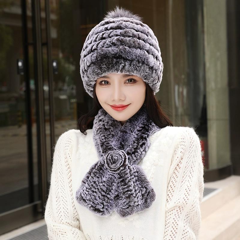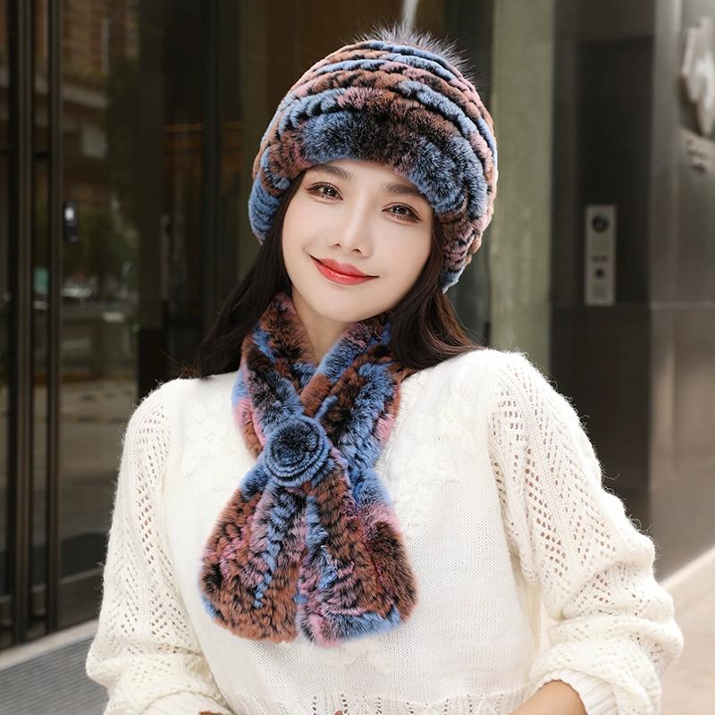 Меховая шапка женская осенне-зимняя из кроличьего рекса теплая с защитой ушей шарф набор из двух предметов для среднего и пожилого возраста бабушки повседневная мамина шапка