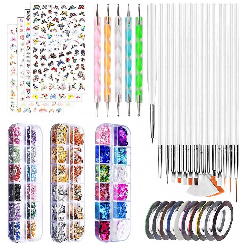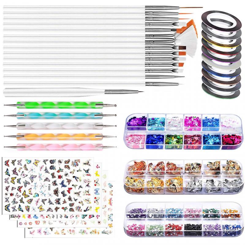Complete nail art decoration kit with nail brushes, rhinestone kit with stickers, dotting pen, foil, flakes, gold and silver thread