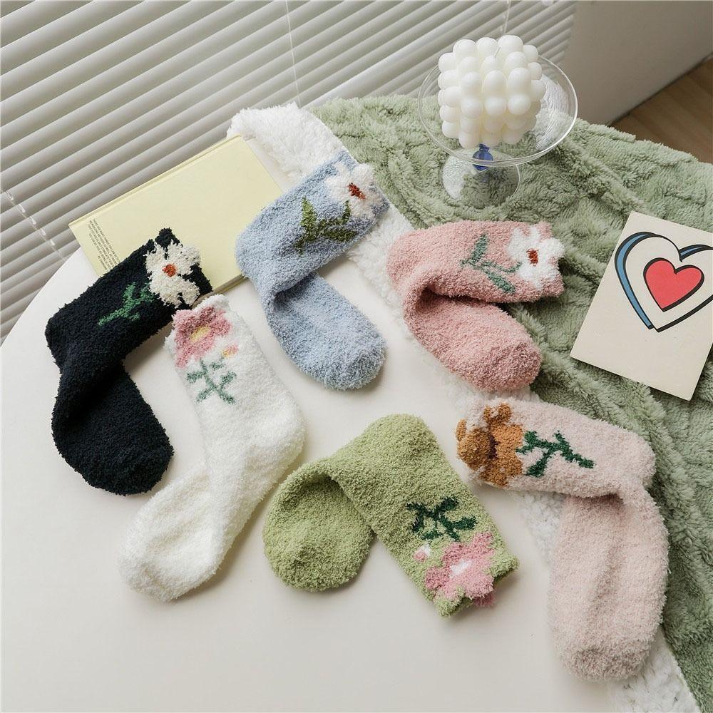 6Pairs Thickened Coral Fleece Socks Flower Warm Socks Women Sweet Floor Plush Socks Autumn