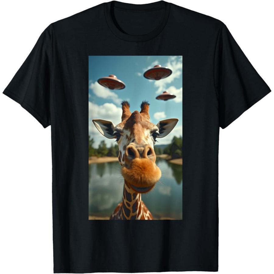Giraffe And UFOs Selfie Weird Giraffe Picture Funny Giraffe T-Shirt