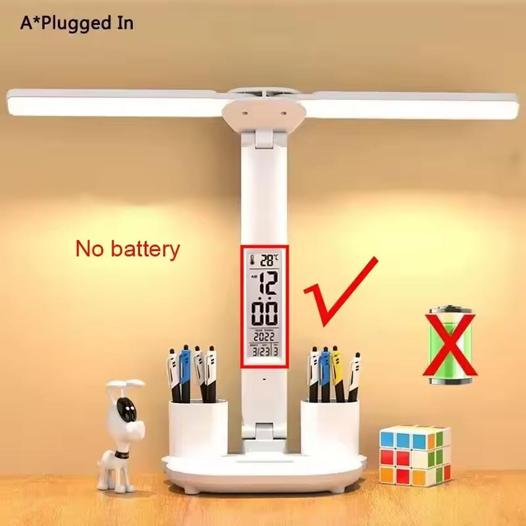 LED Table Lamp USB Chargeable Dimmable Clock Desk Lamps 2 Heads 180 Rotate Foldable Eye Protection Desktop Reading Night Lights