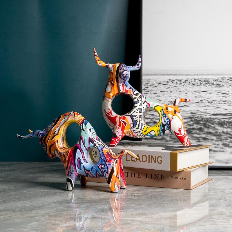 Colorful Cattle Animal Ox Statue Home Decor Living Room Bull Sculpture TV Cabinet Ornament Crafts Abstract Figurine