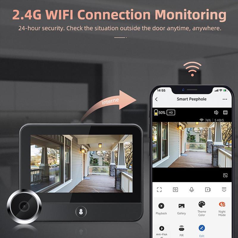 Features:(mini300)* 4.3-inch LCD digital display & 2 million high definition camera: It can be wirelessly connected to the WiFi router. Full-view 4.3-inch IPS high definition LCD screen, no color cast when viewed up, down, left, and right. 165° ultra-wide-angle field of view, 2 million pixels, 1080P video high-pixel retains more picture details. Supports 1440P high-definition night vision, real-time viewing and calling on mobile app, video intercom, and remote monitoring.* Two-way voice intercom: You can tell the courier where the package is placed, or warn strangers, thieves, peepers, etc. to stay away from your home. No need to open the door or communicate face to face, this smart doorbell camera with two-way intercom function can avoid unnecessary dangers or accidents for your family through APP.* PIR human detection automatic capture: When someone enters the sensing range, the system will automatically capture and record the video and the mobile phone will remotely alarm.* Doorbell & monitoring: When the visitor presses the doorbell, the mobile phone can see and talk, or it can be monitored, and the monitoring outside the door can be directly viewed through the mobile phone.* Long battery life: built-in 5000 mAh large-capacity rechargeable lithium battery, long-lasting standby, more environmentally friendly.* Sharing: Supports multiple people to watch online at the same time, and can share multiple mobile phones to meet the needs of general families without worrying about missing alarms.Note: It can be used without a memory card, but it cannot playback or store historical records.Instructions for use:The outdoor doorbell and display are installed on the door through the cat's eye hole. There is a cable connecting the outdoor doorbell and the display. After assembly, connect to the Tu ya app for use. (The manual has specific product installation and app connection instructions)Specification:(mini300)Name: Smart Video DoorbellOutdoor unit material: zinc alloyDisplay: 4.3-inch high-definition screenLens: infrared fill lightDaytime image effect: high-definition true colorNighttime image effect: monitoring level imageDefinition: 1440PWiFi frequency band: 2.4GHZViewing angle: wide anglePower supply method: The whole set of equipment is charged through the Type-C port of the indoor displayRemote intercom: supportCloud storage: supportStorage: support memory card (without memory card)Installation method: punchingDisplay size: 110 * 88mmOutdoor doorbell: 37mmPacking included:(mini300)1 * Display1 * Outdoor Doorbell1 * Charging Cable1 * Set Of Installation Accessories