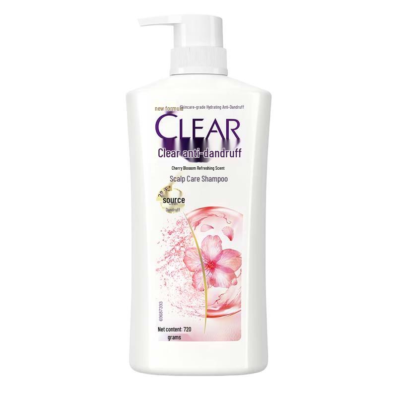CLEAR Anti-Dandruff Shampoo with a refreshing cherry blossom scent. This scalp care formula is designed for normal hair and helps manage oily scalps, providing effective dandruff relief. Comes in a 720g bottle with a 3-year shelf life.