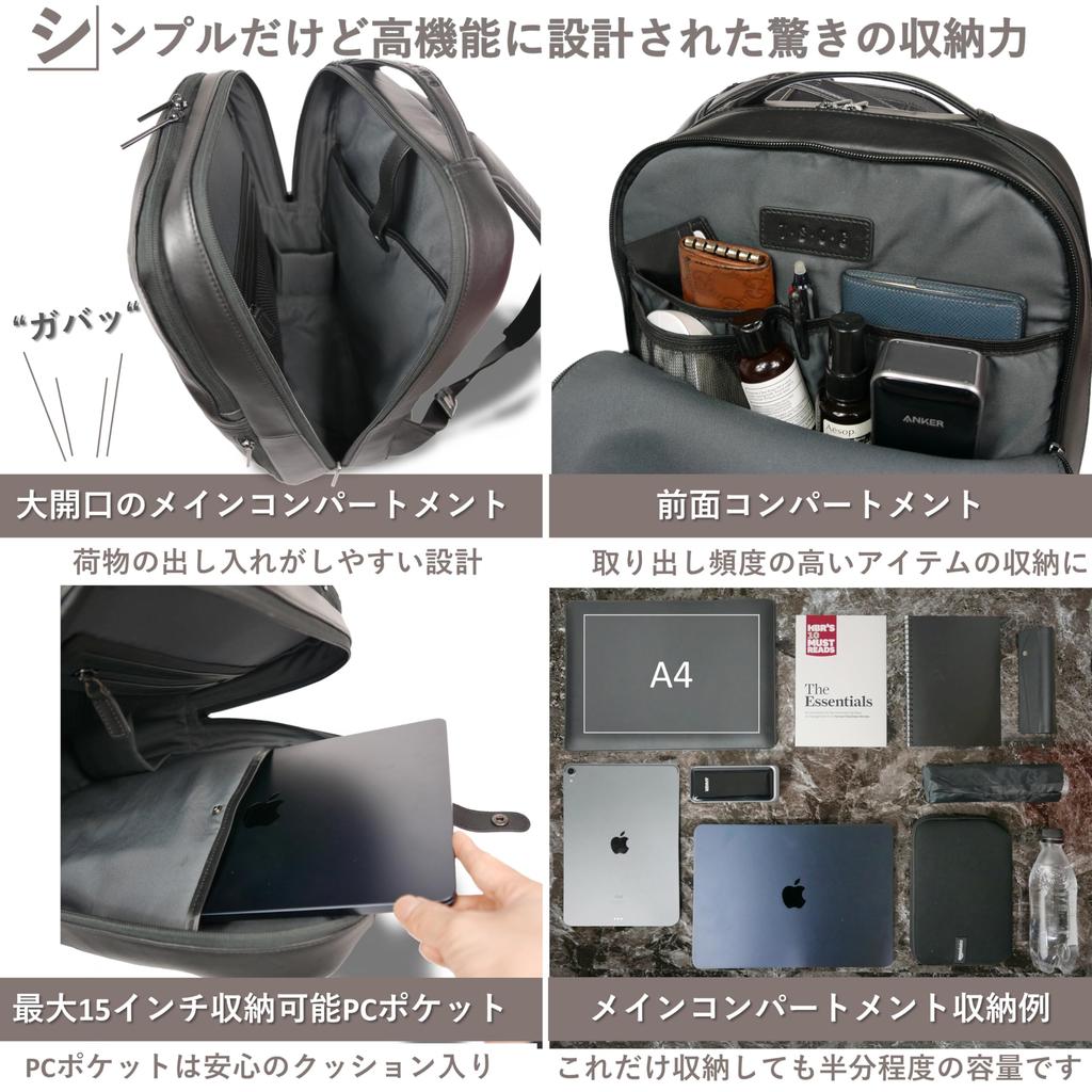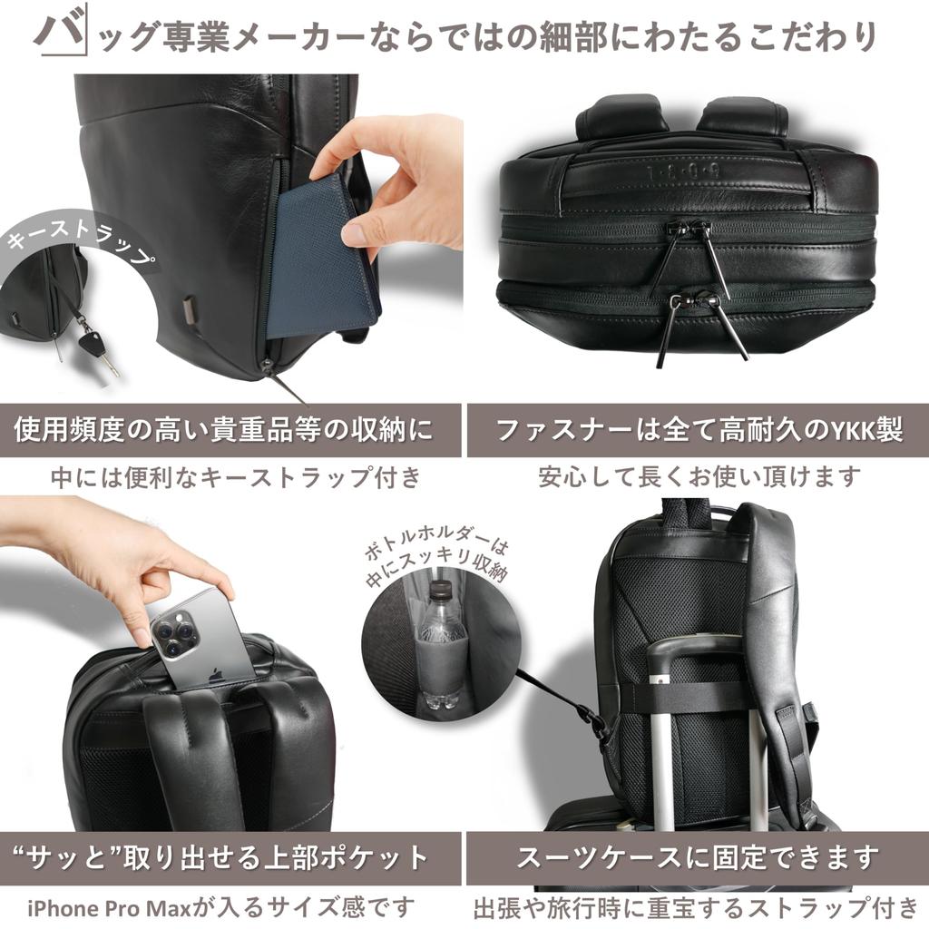 [Highly functional] This simple yet highly functional bag offers amazing storage capacity. The main compartment opens wide, with one zipper opening all the way to the bottom, making it easy to load and unload your belongings. The front compartment is spacious, measuring approximately 22.5cm tall and 17.5cm wide, making it a convenient size for storing small items. Inside, there are two pockets, one mesh pocket, and a pen holder, so you won't have any trouble storing small items. Additionally, the exterior back pocket is large enough to fit a large smartphone (such as an iPhone Pro Max), and the lower side pocket on the front exterior has a convenient key strap for storing a long wallet or keys. When traveling or on business, the backpack can also be used as a carry-on bag by slipping it onto a suitcase.