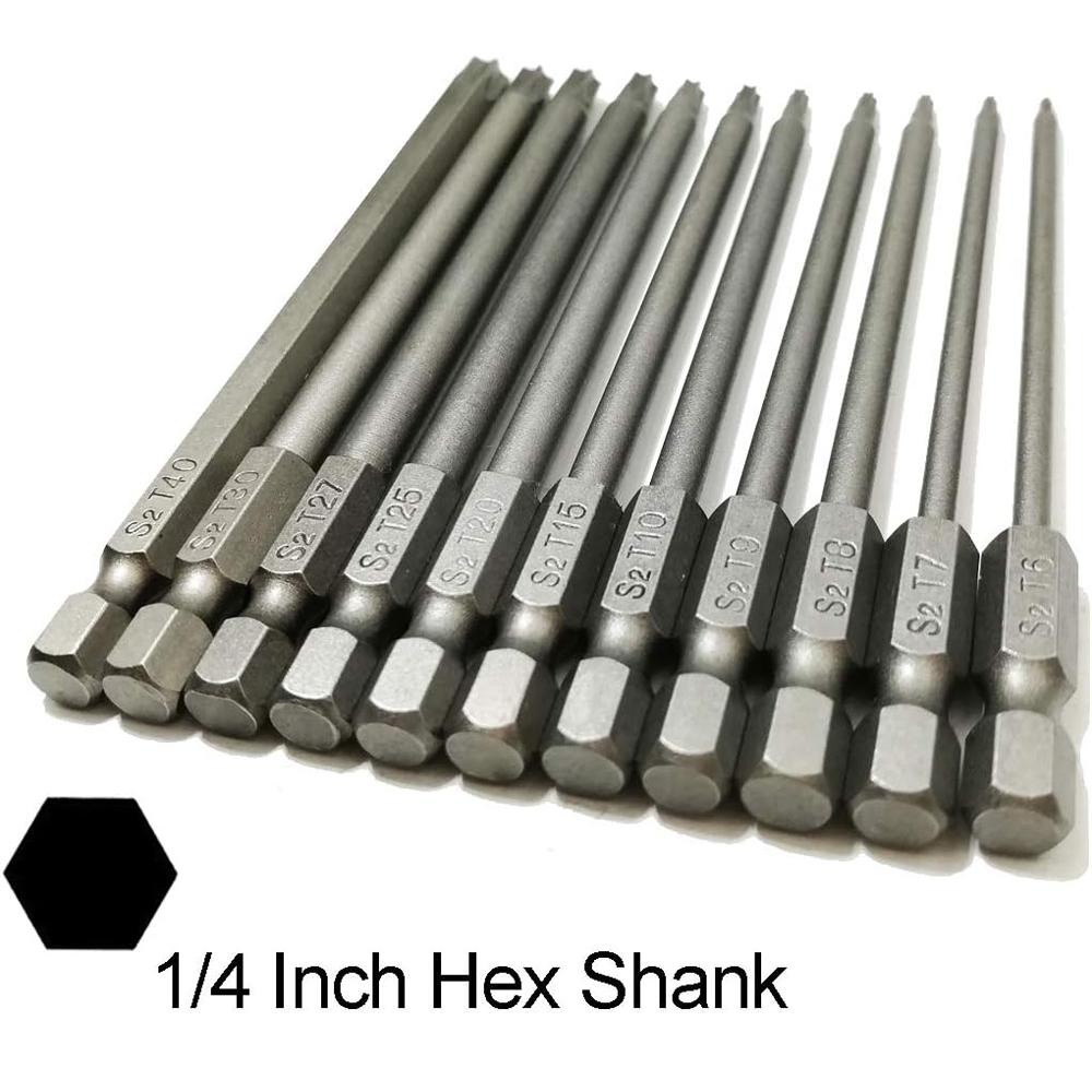 Набор из 11 бит Torx с магнитным шестигранным хвостовиком 1/4 дюйма из стали S2, длинные сверла, безопасные биты Torx T6-T40 50/100 мм
