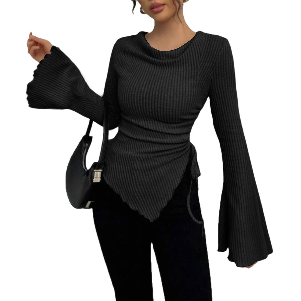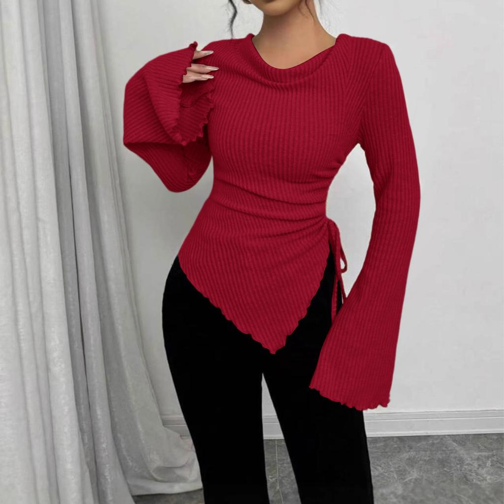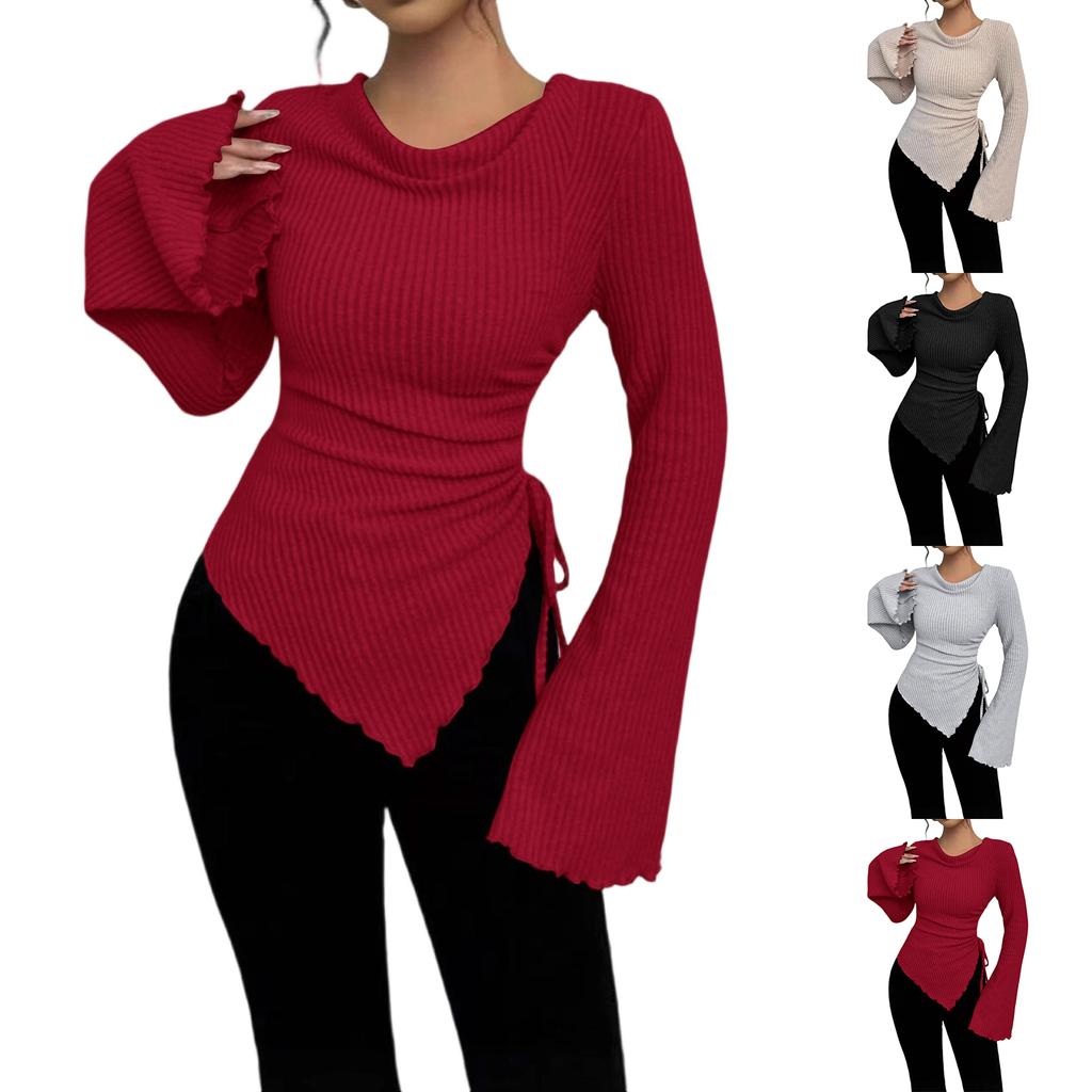 Женская модная повседневная футболка с длинными рукавами, однотонная, с неровным подолом, рукавами-фонариками, дизайном на кулиске, облегающего кроя, пуловер, топ с круглым вырезом