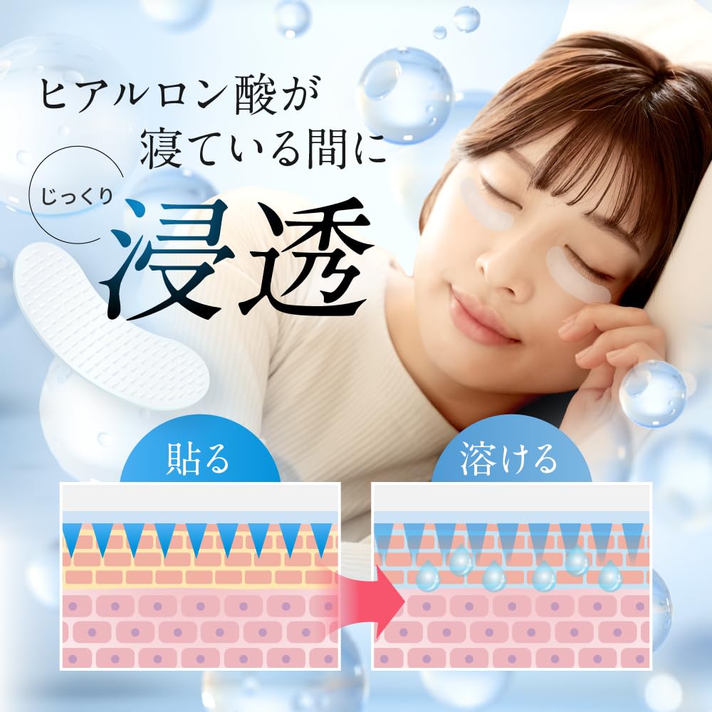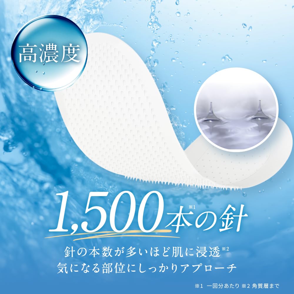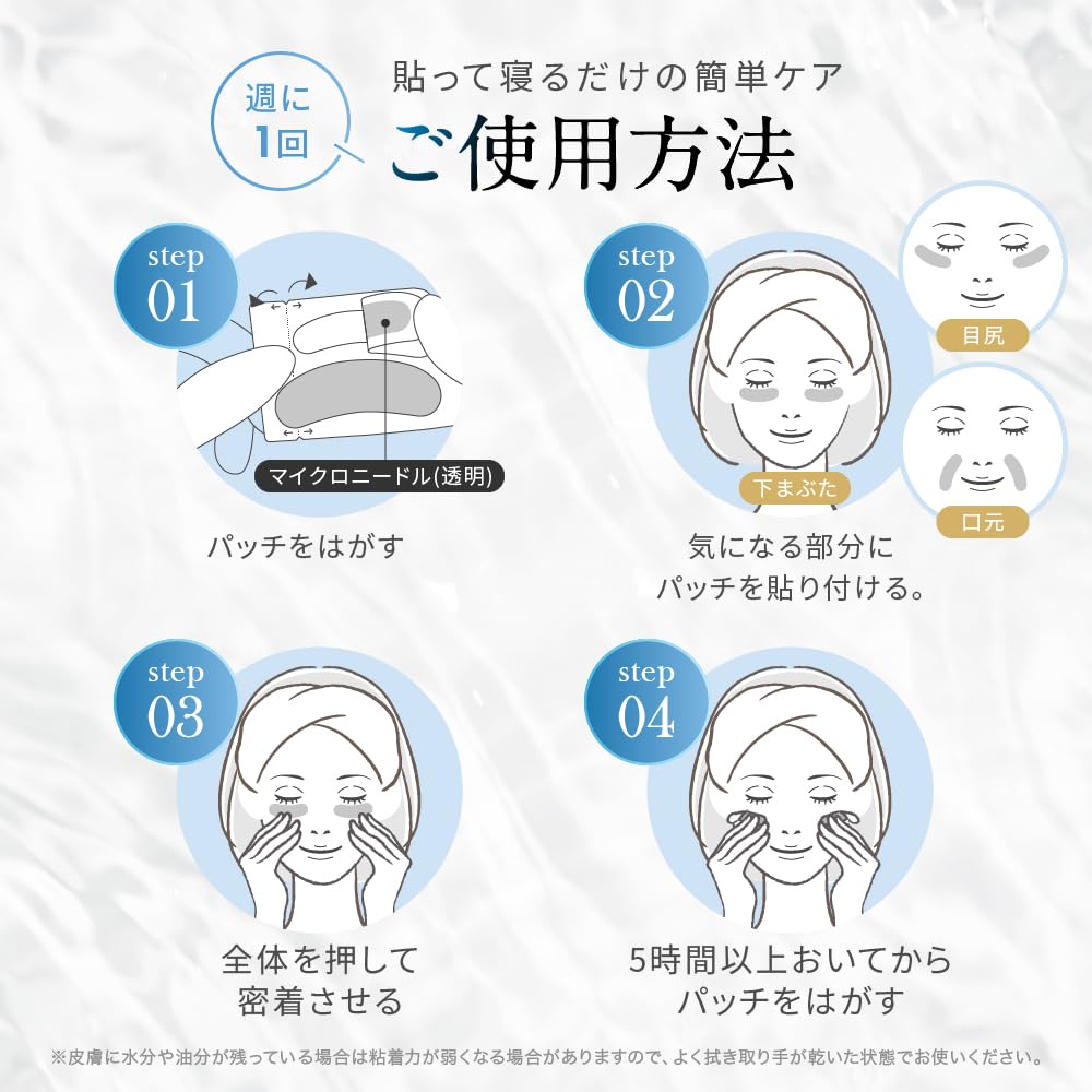 [Микроиглы, растворяющие коллаген] Примерно 1500 микроигл (одна доза) воздействует на проблемную зону, доставляя увлажняющие ингредиенты в роговой слой вокруг глаз и рта, которые склонны к сухости. Просто наклейте пластырь и ложитесь спать для легкого ухода. Иглы, содержащие гиалуроновую кислоту*1 и культуральную жидкость стволовых клеток человека*2, медленно растворяются и проникают глубоко в роговой слой. Мы рекомендуем оставить его включенным не менее чем на 5 часов. *1 Гиалуронат натрия *2 Кондиционированная культуральная жидкость стволовых клеток человека. Используйте один или два раза в неделю в качестве премиального ночного ухода. [Содержит более 99% косметических ингредиентов] Содержит сбалансированную смесь увлажняющих косметических ингредиентов, включая гиалуроновую кислоту, глутатион, ниацинамид и экстракт плаценты (увлажняющий ингредиент). Используя масляно-гелевый материал вместо клея, эти патчи для глаз легко прилипают к коже.