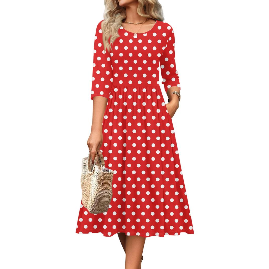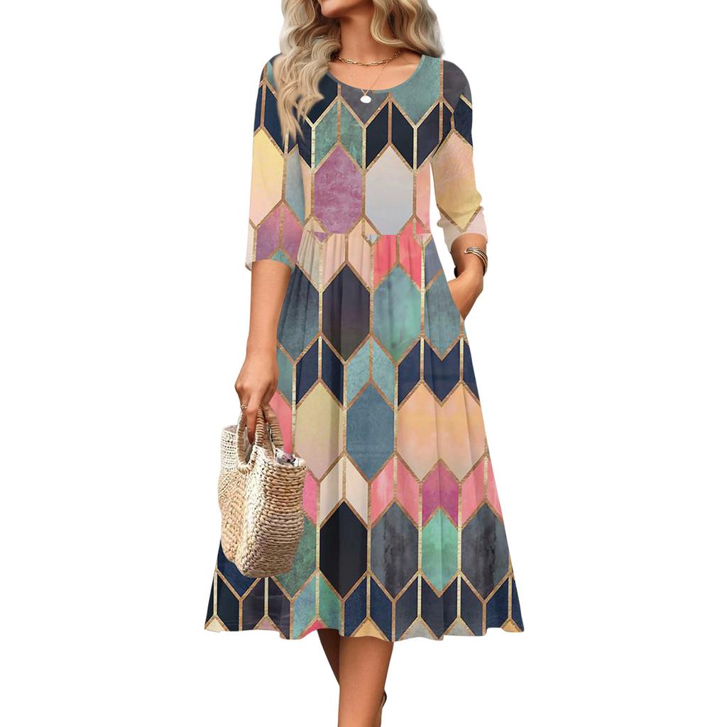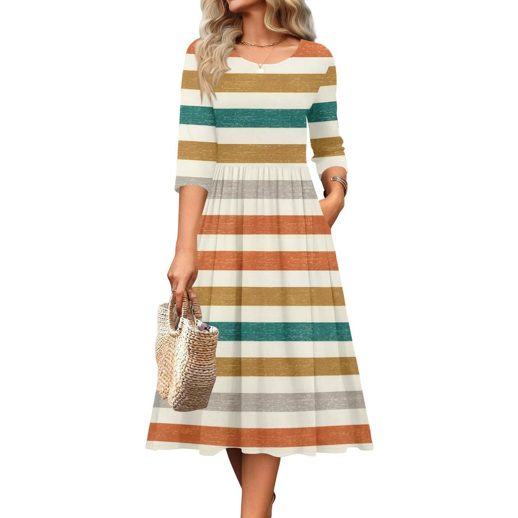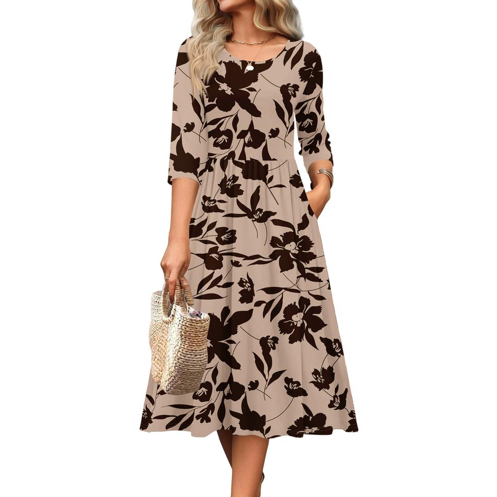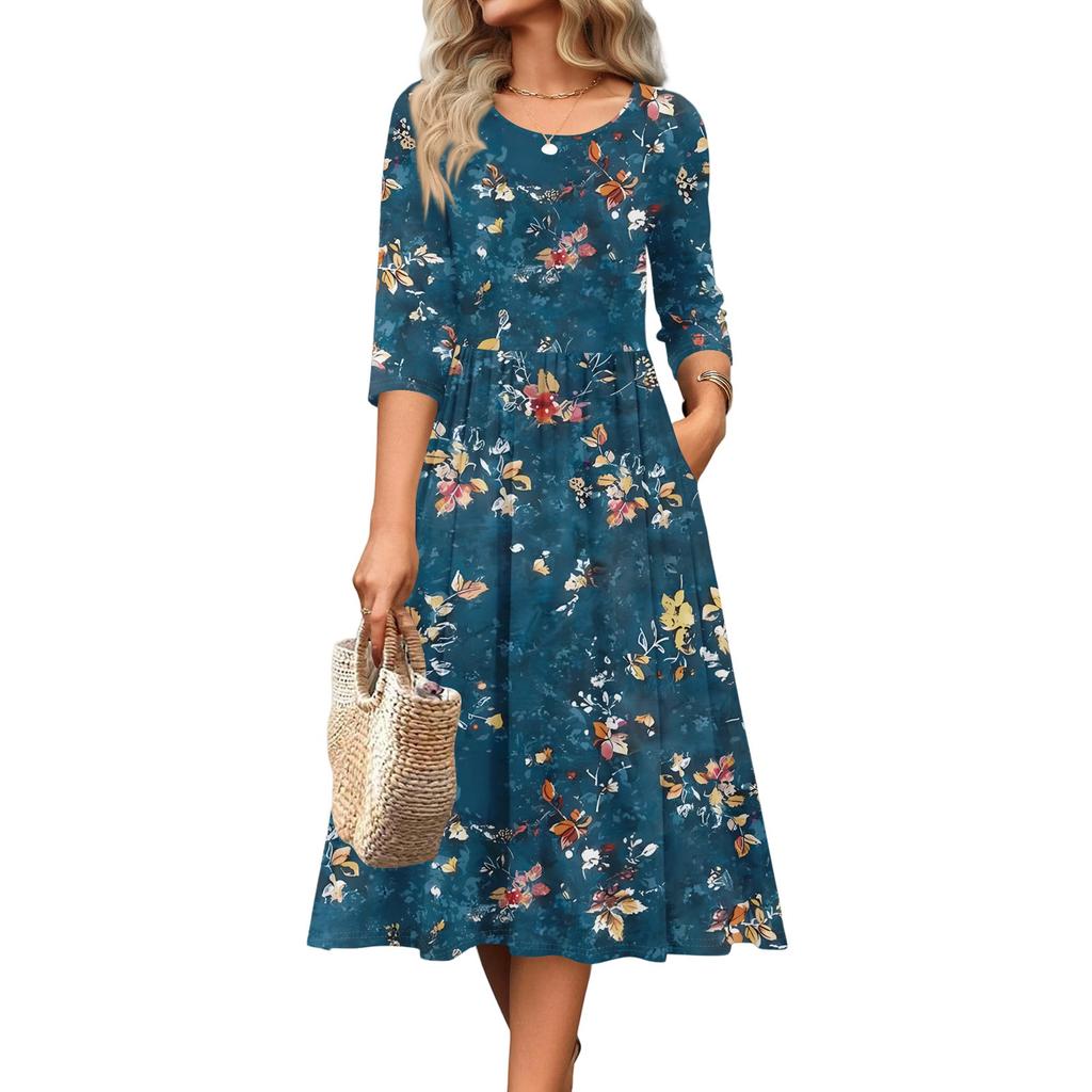 Женское платье с рукавом 3/4, повседневное, свободное, А-силуэта, миди, футболка, с карманами, с круглым вырезом, для отпуска, в стиле бохо, пляжный сарафан