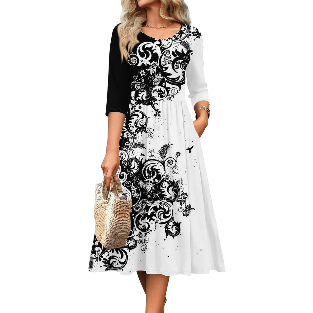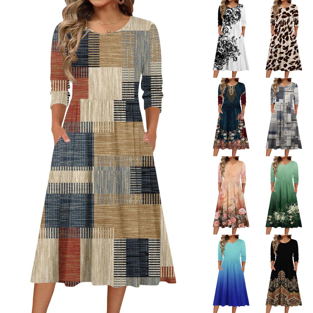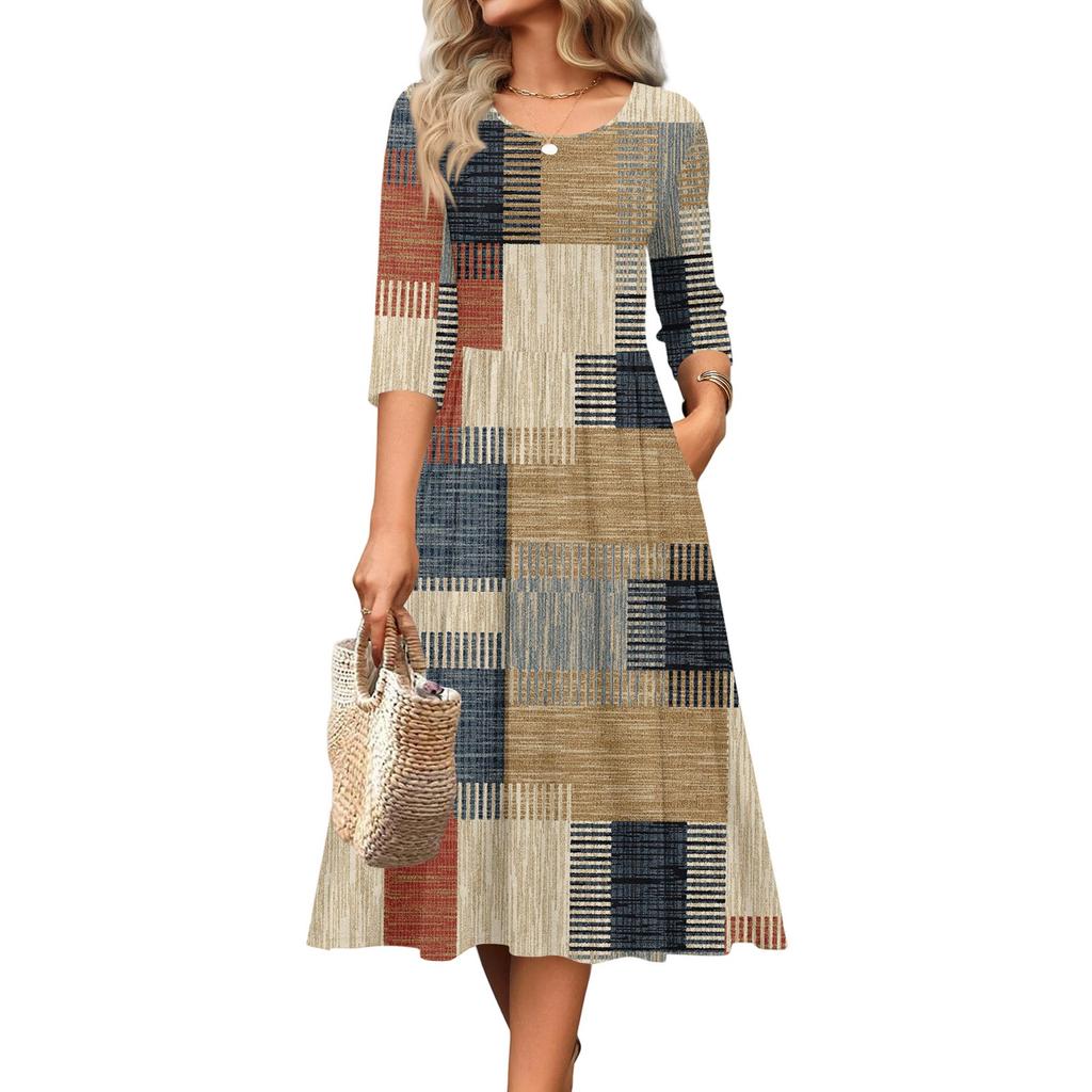 Женское платье с рукавом 3/4, повседневное, свободное, А-силуэта, миди, футболка, с карманами, с круглым вырезом, для отпуска, в стиле бохо, пляжный сарафан