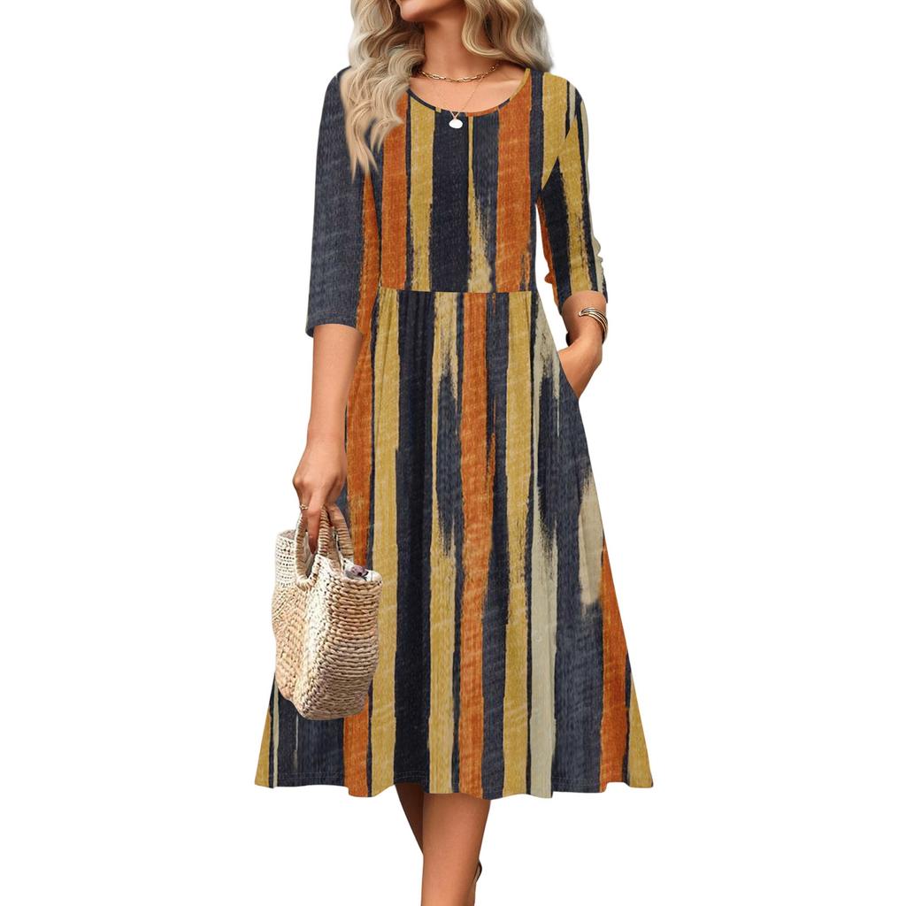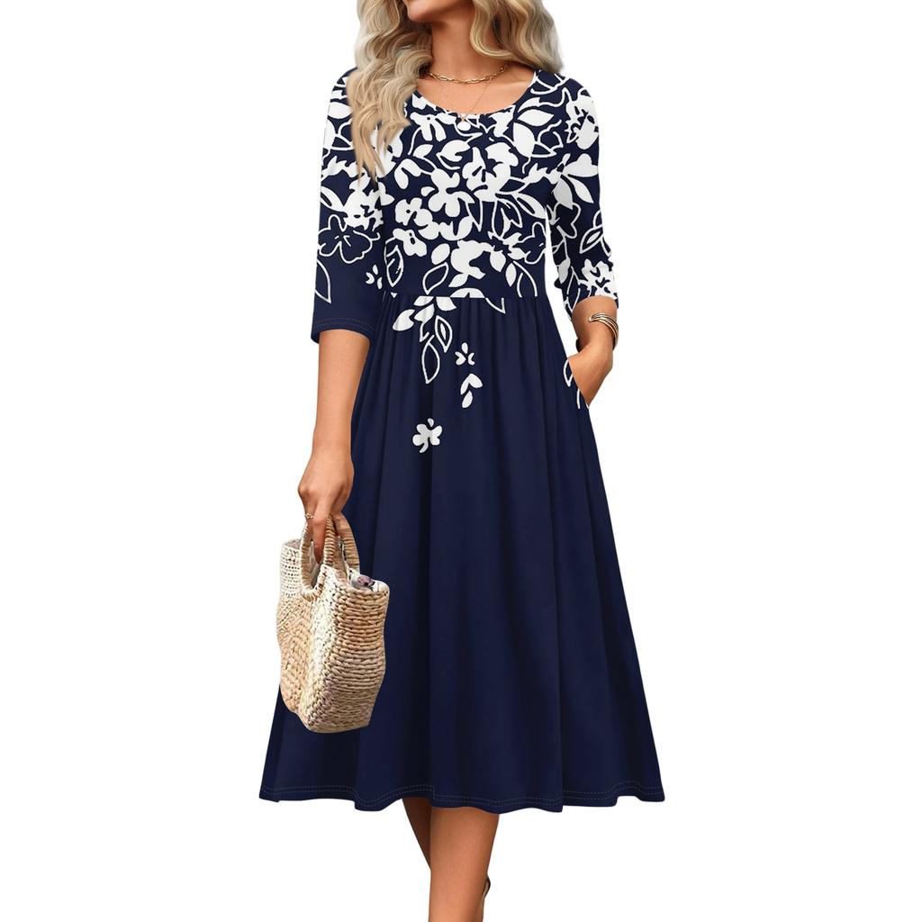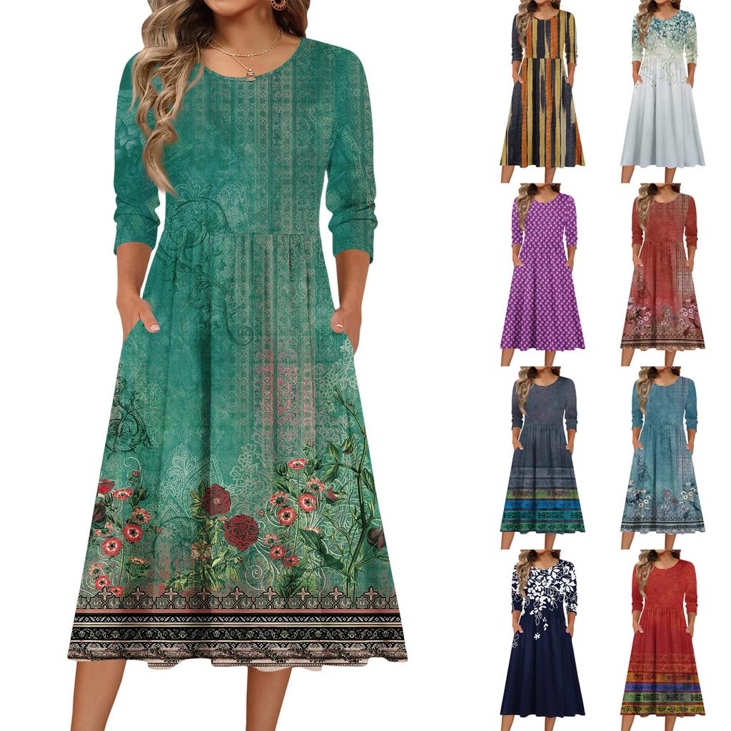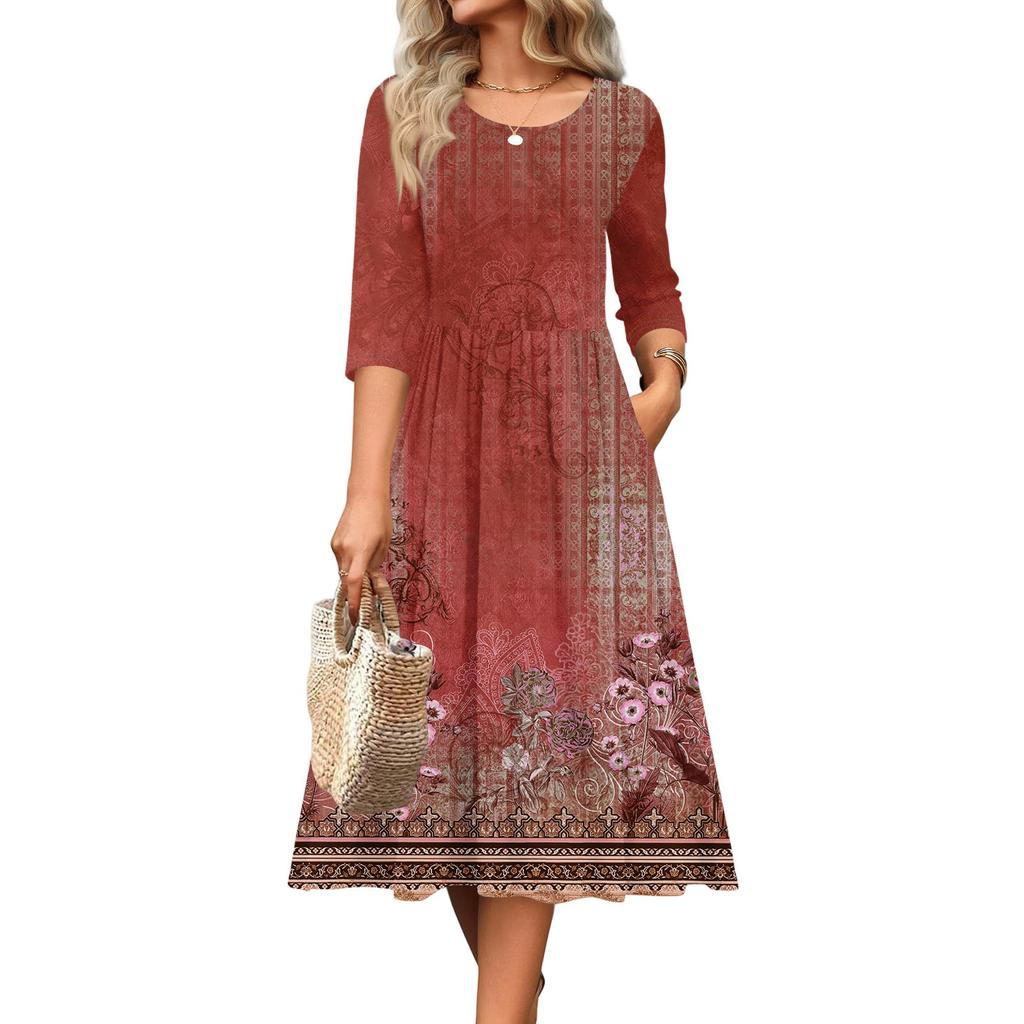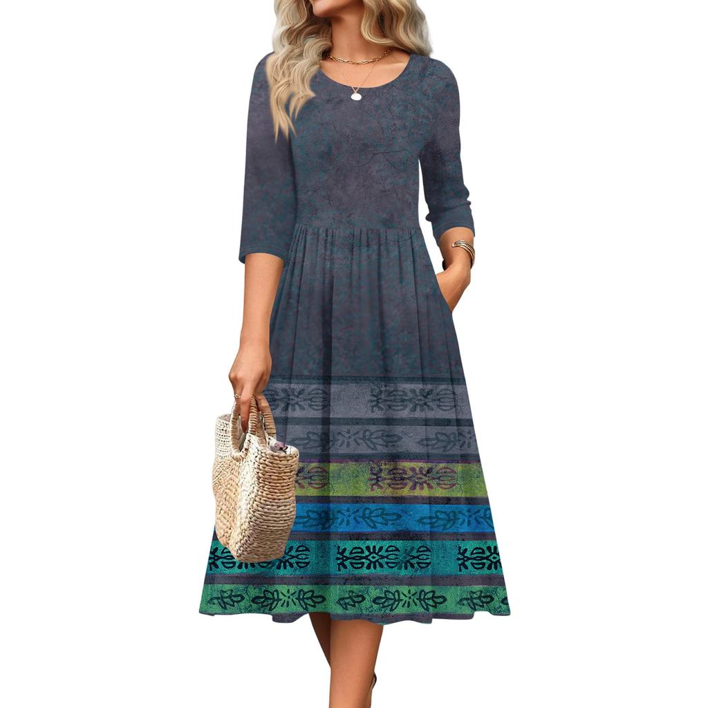 Женское платье с рукавом 3/4, повседневное, свободное, А-силуэта, миди, футболка, с карманами, с круглым вырезом, для отпуска, в стиле бохо, пляжный сарафан