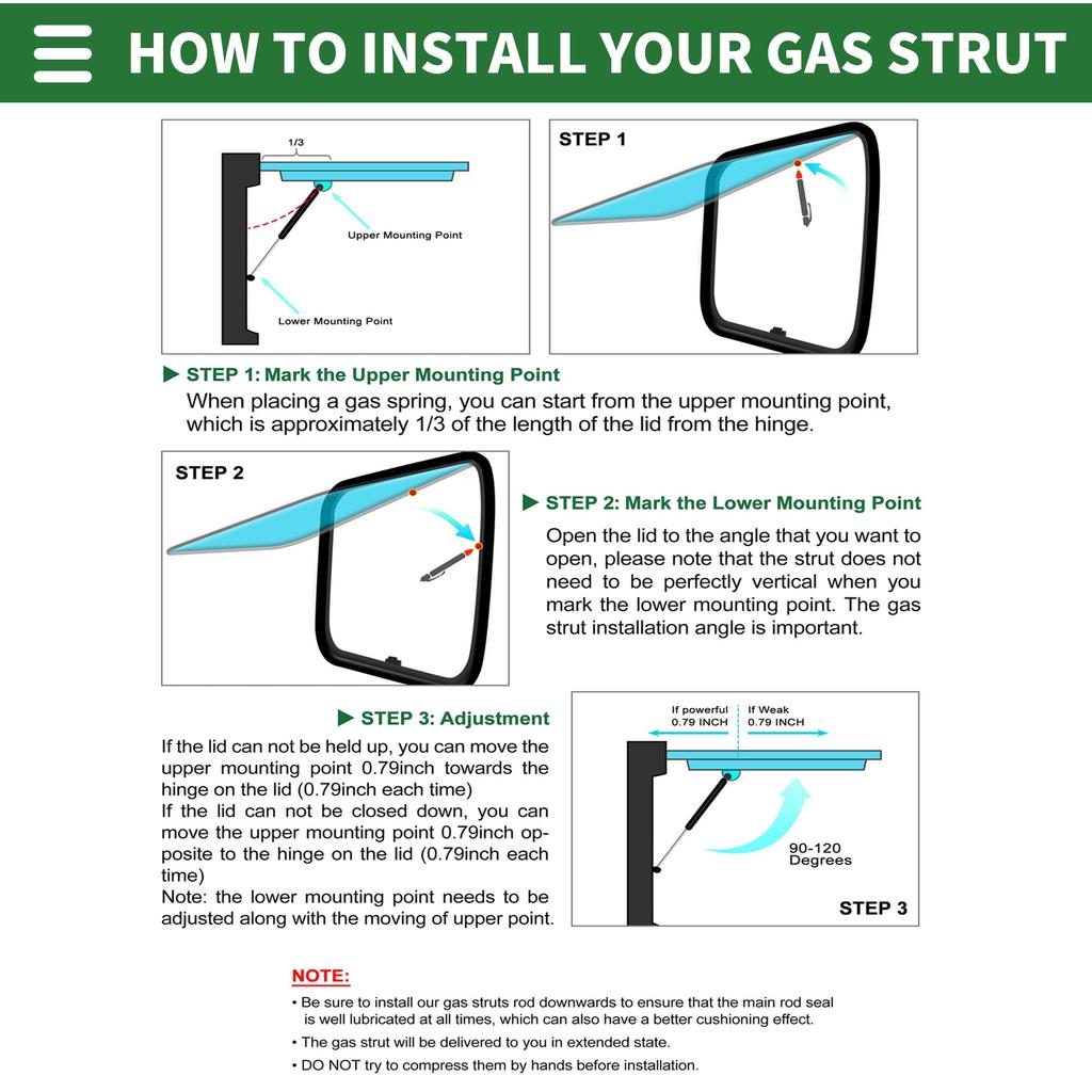 Инструкция по установке: Простая установка. Измерьте монтажное расстояние, закрепите монтажный кронштейн и запрессуйте новую газовую пружину на место.