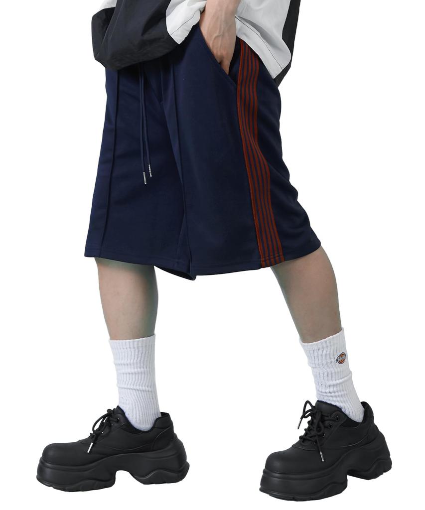 These half-track pants exude a retro vibe, sporty yet street-inspired. Available in classic black and white, as well as the ever-popular navy. Crafted from stretchy, breathable polyester jersey, they offer exceptional comfort. The choice of color allows you to create a unique look, whether you're creating a monochrome or multicolored outfit. The adjustable drawstring at the waist makes these easy-to-wear pants. While reminiscent of a '90s vintage silhouette, they also exude a modern flair. Perfect for street, skater, and Korean fashion, they also pair with a track jacket made from the same material. These pants are perfect for both men and women with a masculine aesthetic.