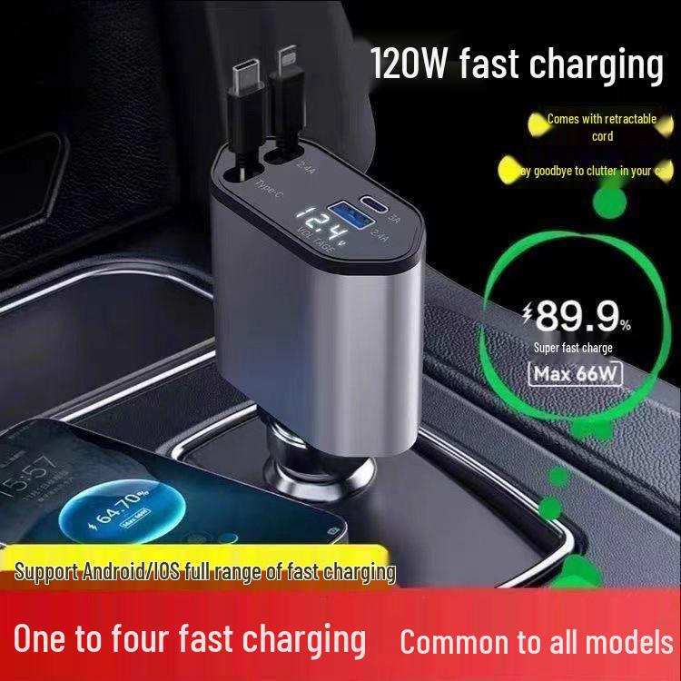 Сверхбыстрая телескопическая автомобильная зарядка 120 Вт с 4 портами для Apple 15 и Huawei