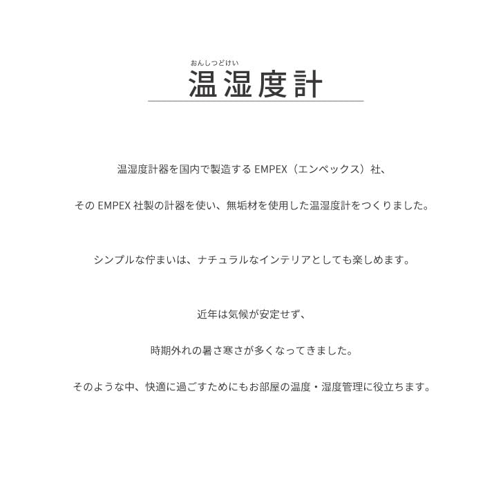 [Empex x KATOMOKU Collaboration Product] KATOMOKU's first thermo-hygrometer. Japan has experienced unprecedented heatwaves in recent years. To help prevent heatstroke, we collaborated with Empex Weather Meter Co., Ltd. to create this "Empex x KATOMOKU" collaboration product. Combining Empex's meteorological expertise with KATOMOKU's simplicity, this thermo-hygrometer can also be enjoyed as part of your interior décor.
