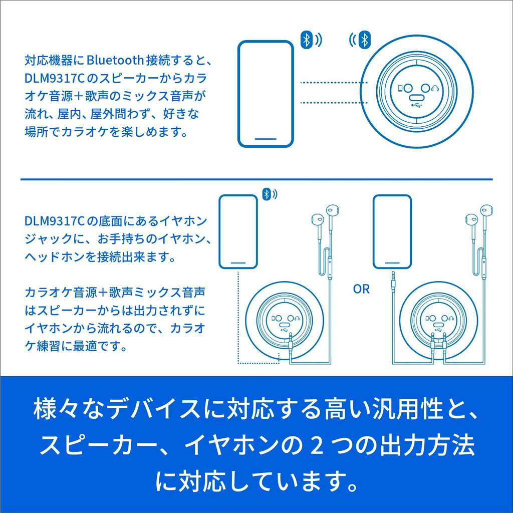 Highly versatile and compatible with a variety of devices: Supporting Bluetooth 5.1 and wired connections, you can enjoy karaoke on a variety of devices, including smartphones. A 3.5mm earphone jack on the bottom of the microphone allows you to listen to the mixed sound of karaoke and your singing voice through your own earphones or headphones. Even when not using a karaoke app, it can also be used as a Bluetooth speaker for listening to music and other music. It also features a "Party Mode" function that allows you to connect two DLM9317C wireless microphones to one smartphone for duets.