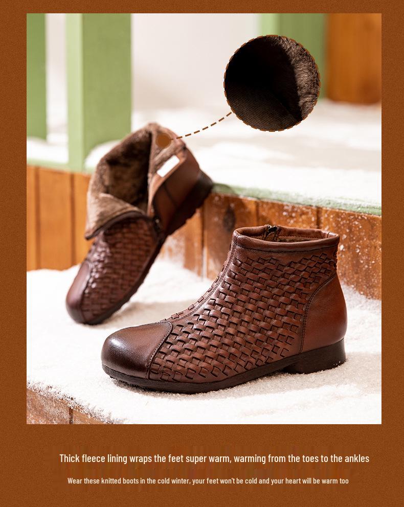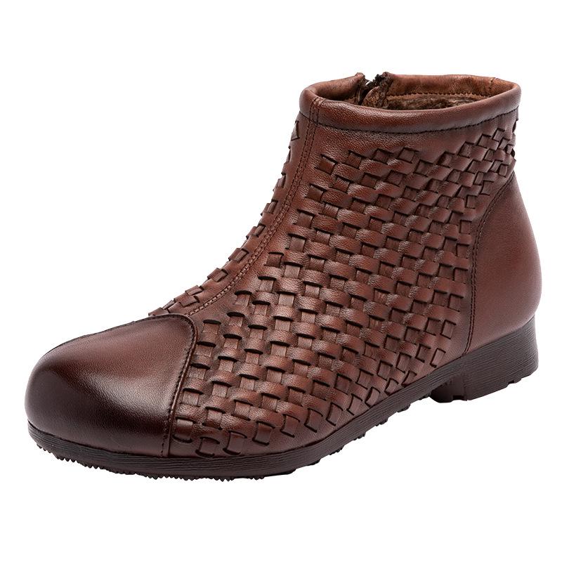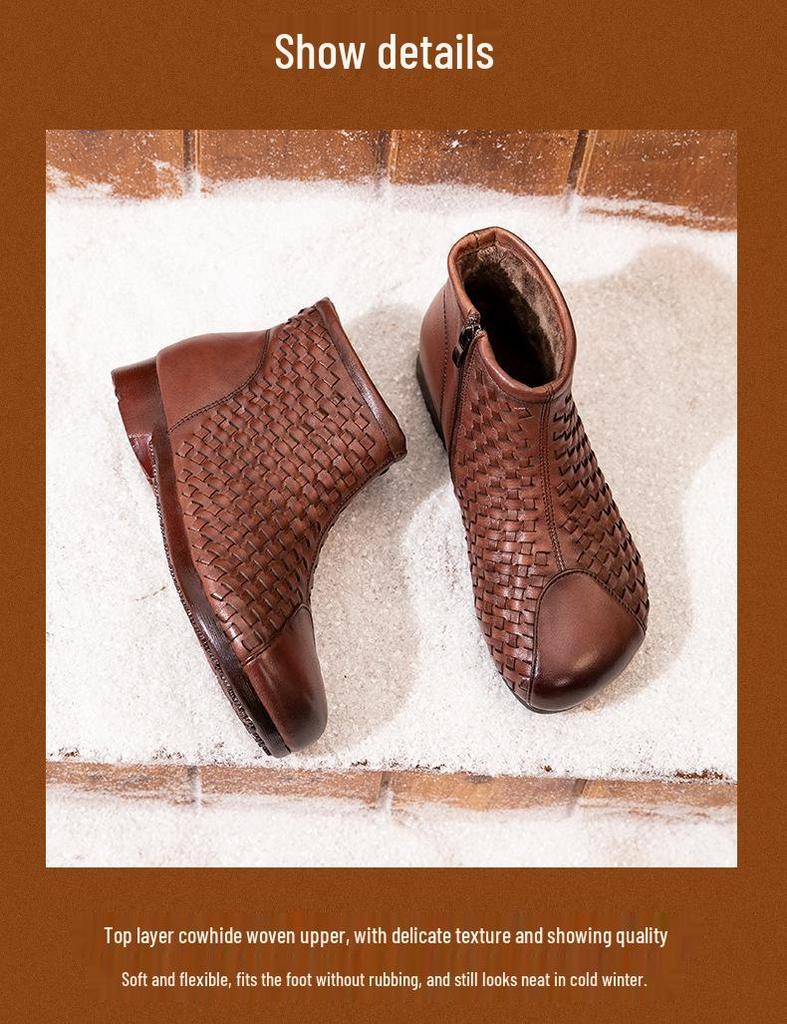 Винтажные плетеные ботильоны из коровьей кожи Осень/Зима 2025: Натуральная кожа, Толстая подошва, Застежка-молния, Ручная работа Женская мода