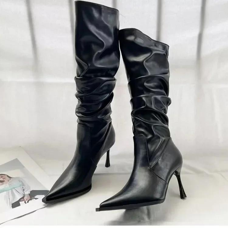 Пикантные зимние женские высокие сапоги, модные высокие сапоги на шпильке с острым носком, женские элегантные сапоги до колена, Botas De Mujer
