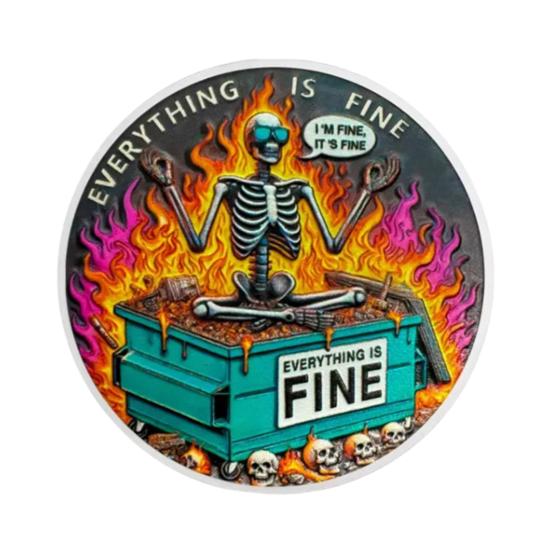 Эта двухсторонняя памятная монета отличается ярким, символичным художественным оформлением, которое отражает стойкость и иронию.. На одной стороне изображен скелет, медитирующий в позе лотоса на зеленом мусорном баке, охваченном ярким пламенем, с ироничной фразой «ВСЕ ХОРОШО» сверху и речевым облачком, говорящим «Я В ПОРЯДКЕ, ВСЕ В ПОРЯДКЕ», что отражает менталитет сохранения спокойствия посреди хаоса.. На обороте изображен скелет, использующий рычаг для перемещения горящего синего мусорного бака, окруженного бушующим пламенем, что символизирует силу, выкованную в невзгодах..
