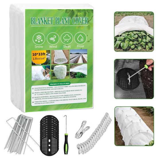 Настраиваемый размер и простая установка: Ткань можно легко разрезать ножницами, чтобы подогнать под любой размер растения или планировку сада.. Входящие в комплект зажимы из нержавеющей стали и U-образные колышки обеспечивают надежное крепление к растениям или опорным кольцам.. Удобная система крючков позволяет быстро снимать и перерабатывать укрытие, упрощая уход за садом и обеспечивая индивидуальную защиту для рассады, кустарников, горшечных растений или больших садовых грядок.