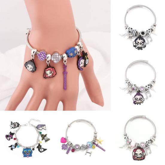 Серебристо-Фиолетовая Фэнтези Эстетика: Этот браслет, демонстрирующий драматичную серебристо-пурпурную цветовую гамму, сочетает элементы готической фэнтези с поп-стилем.. Детализированная эмалированная гламурность подчеркивает фирменные мотивы, такие как кот-демон Моро и клинковый страж Астра, создавая визуально яркий аксессуар.