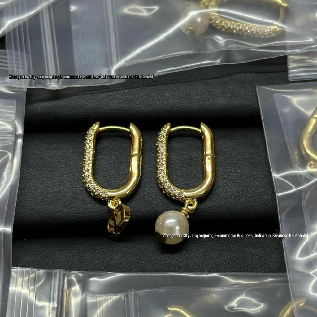 Elegant D-Shaped Pearl & Half-Diamond Asymmetrical Earrings - Minimalist Versatile Studs — купить товар онлайн с бесплатной доставкой по всему миру!
