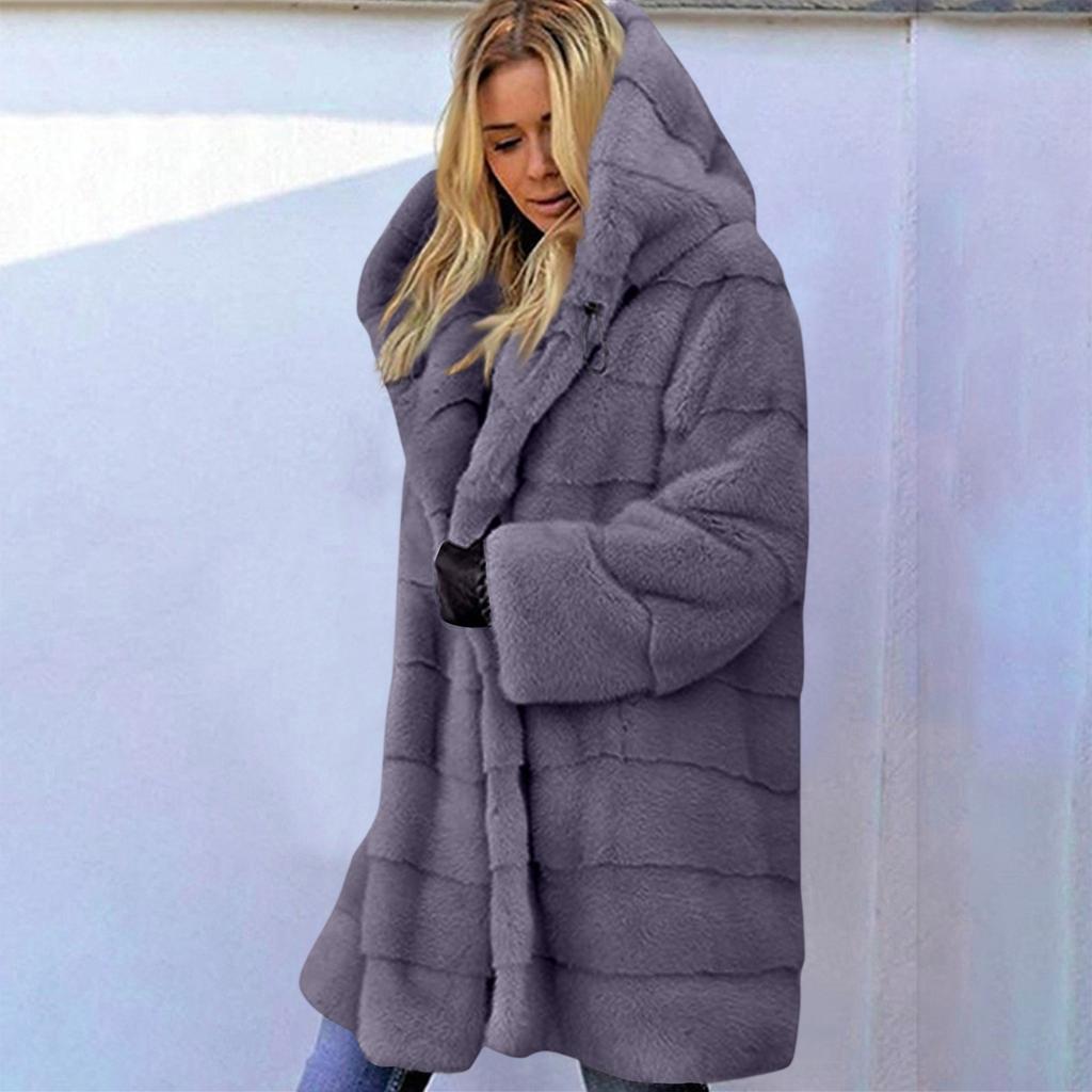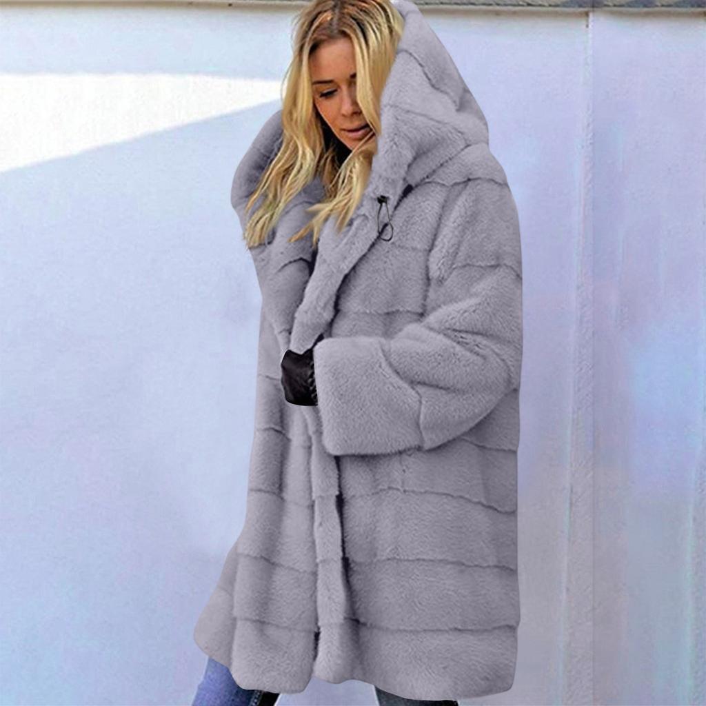 Женское плюшевое пальто средней длины свободного кроя с капюшоном, однотонное