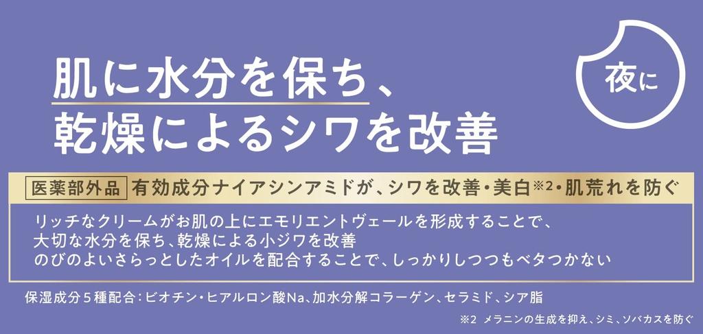 The active ingredient niacinamide reduces wrinkles, brightens* skin, and prevents roughness. The rich cream forms an emollient veil over the skin, retaining essential moisture and reducing fine lines caused by dryness. Formulated with a smooth, easy-to-spread oil for firmness without stickiness. Contains five moisturizing ingredients (biotin, sodium hyaluronate, hydrolyzed collagen, ceramide, shea butter).