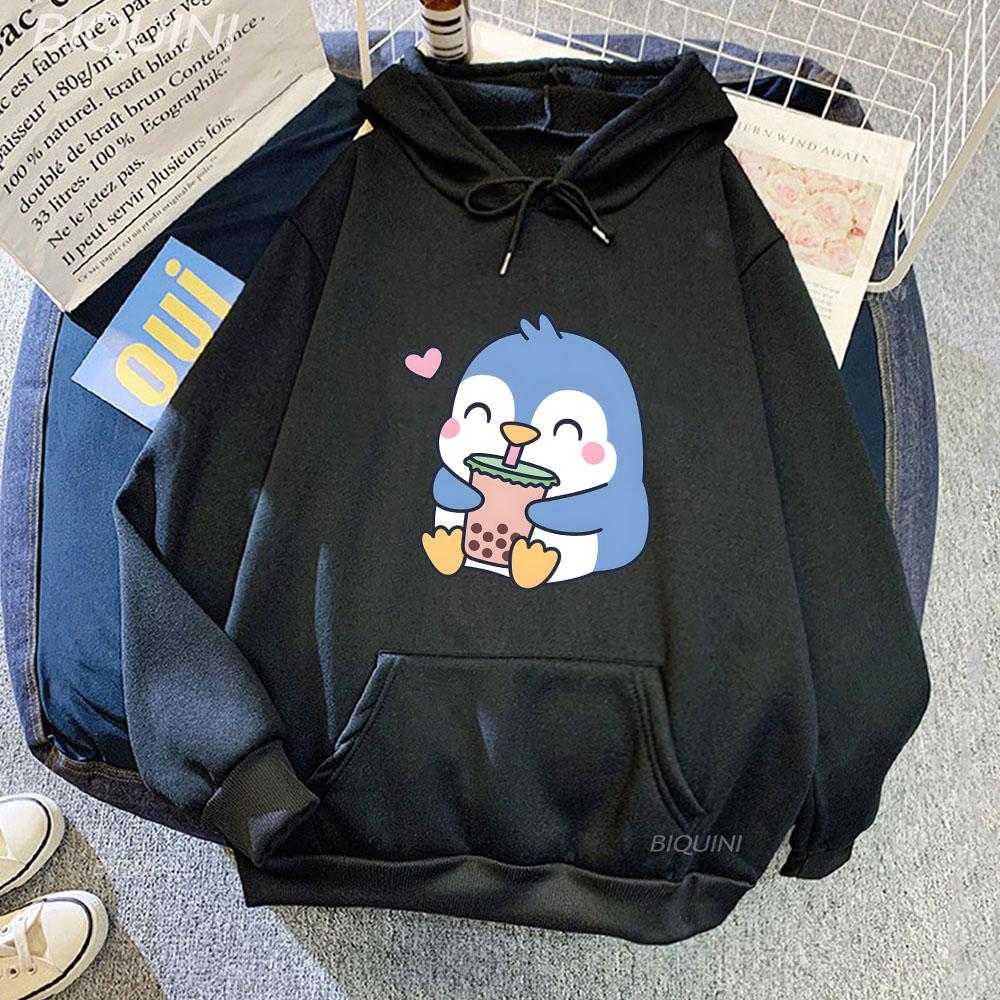 Bubble Boba Milk Tea Cartoon Hoodies Women Penguin Graphic Sweatshirts Unisex Clothes Kawaii Anime Harajuku Plus Size Hoodie