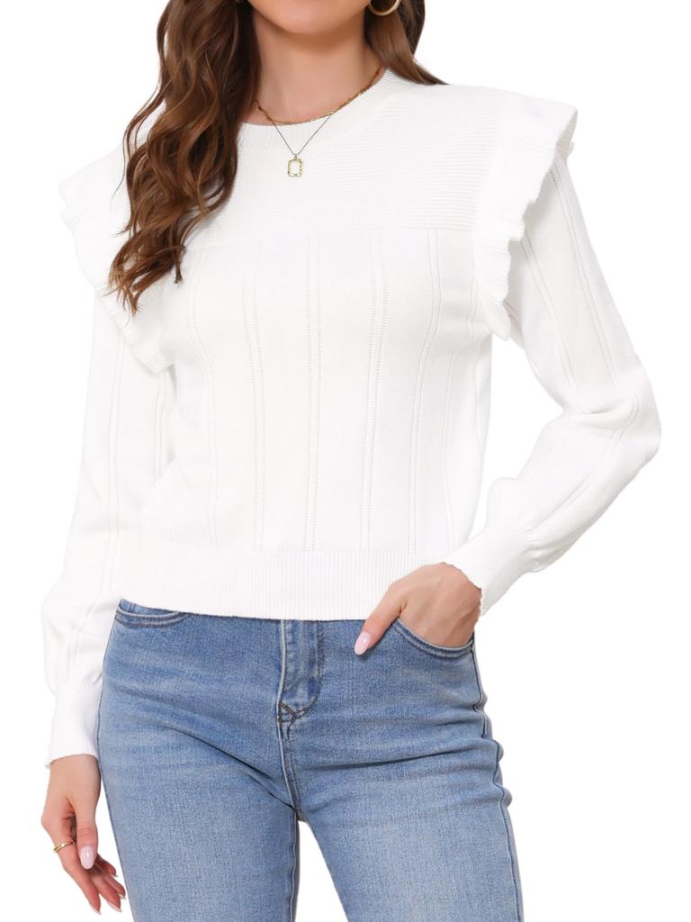 Allegra K Women's Cropped Sweater, Pullover, Crew Neck, Cute Ruffles, Long Sleeves, Knit Sweater, Top, Casual Outfit, Solid White, Size M
