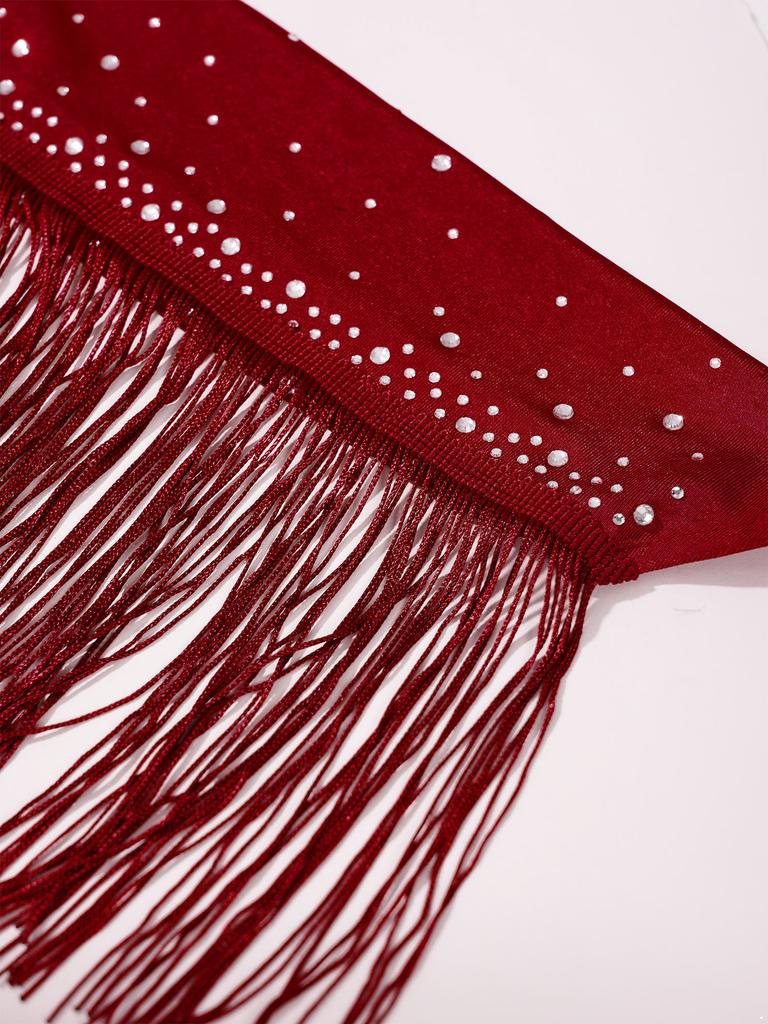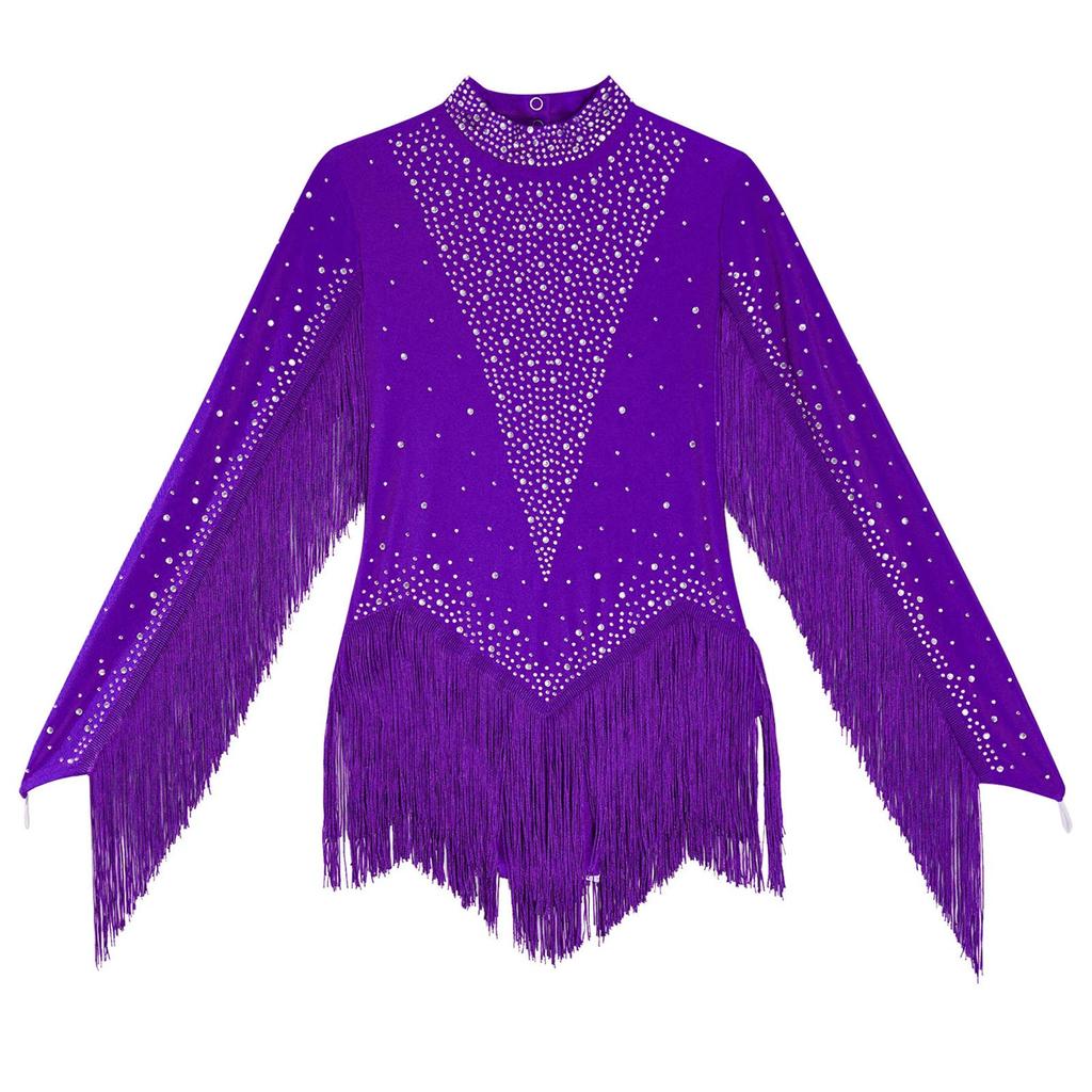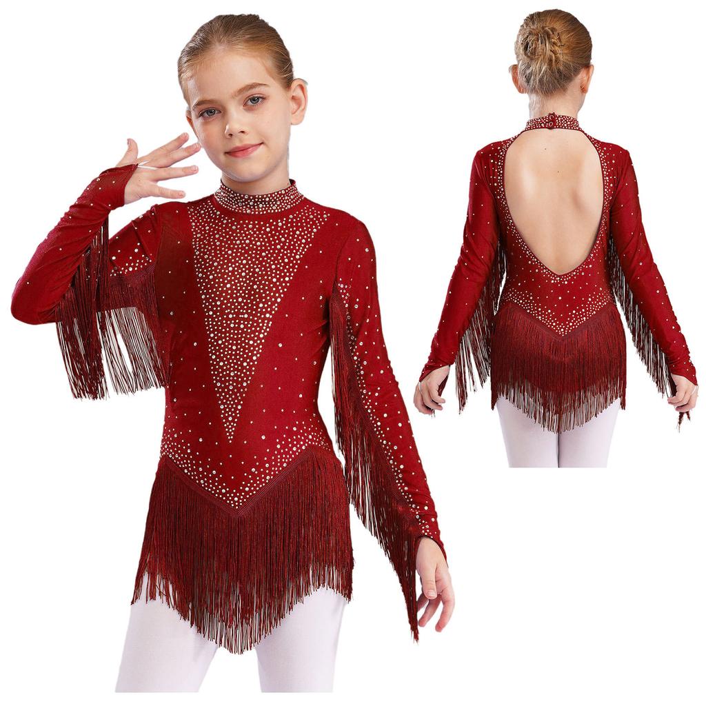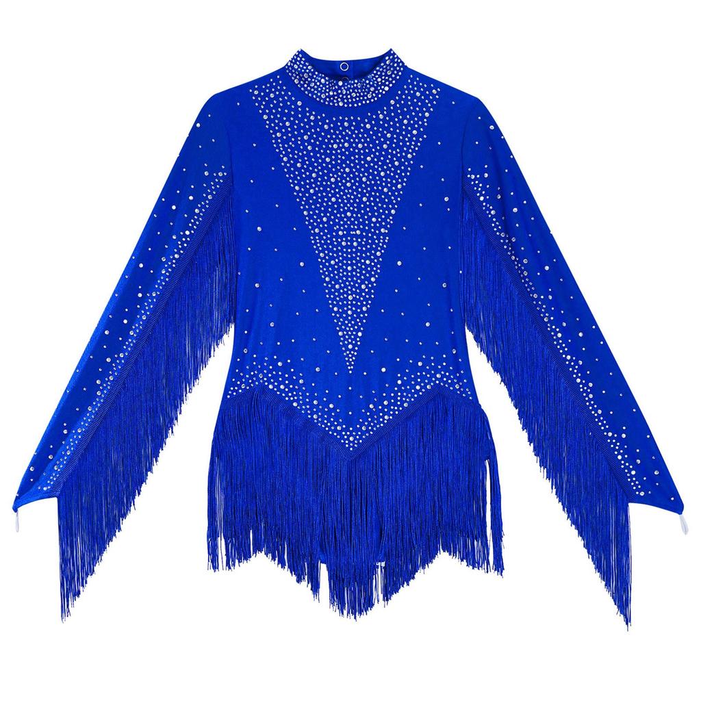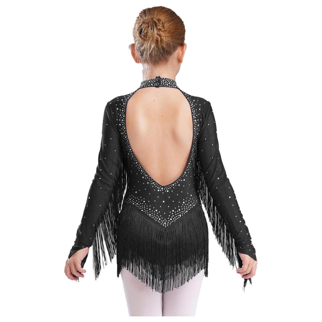 Боди для латиноамериканских танцев с кисточками для девочек, с воротником-стойкой, длинными рукавами, вырезом на спине, сверкающими стразами и бахромой