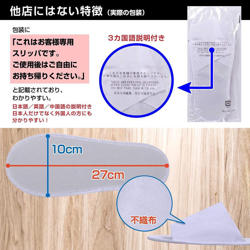 На упаковке указано: «Эти тапочки предназначены для вашего исключительного использования». Пожалуйста, не стесняйтесь забрать их домой после использования." Это легко понять. Индивидуально упаковано с посланием на внешней стороне (с текстом) на японском, английском и китайском.