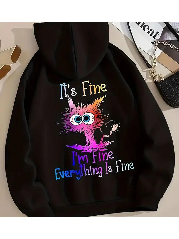 I'm Fine Everthing Is Fine Letter Printed Women Hoodies Fashion Fleece Hoody Creativity Street Loose Cotton Sweatshirts Plussize